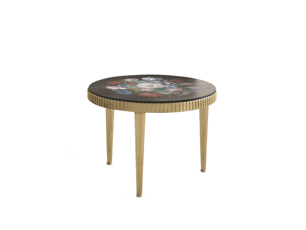 黄铜结构边桌。顶部采用木材,用维也纳花卉油技术手绘。