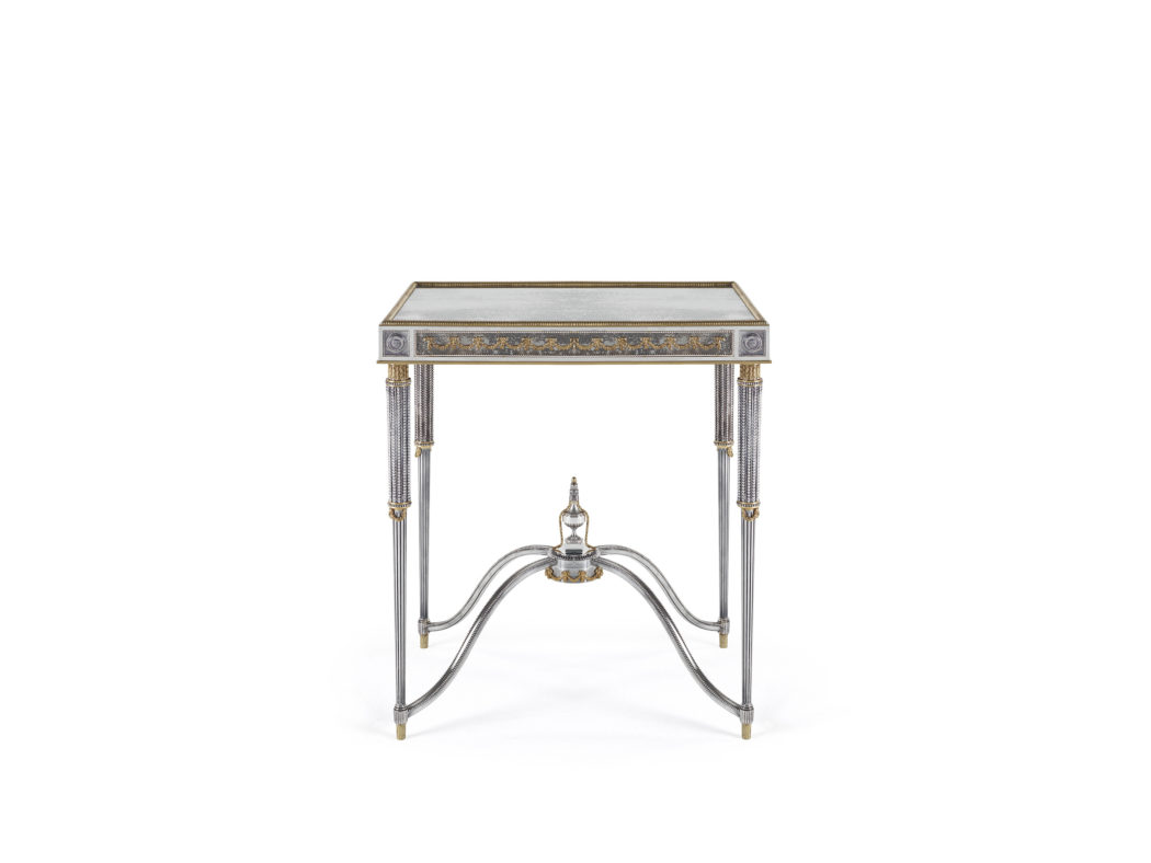 黄铜结构边桌。失落的蜡铸造装饰元素,以古董黄铜和银制成。黄铜顶部,复古银色。