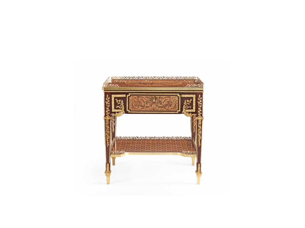 边桌采用单板桃花心木结构,镶嵌顶部和失蜡铸造黄铜装饰元素。还提供白色漆木结构,顶部为白色纳米比亚犀牛大理石。