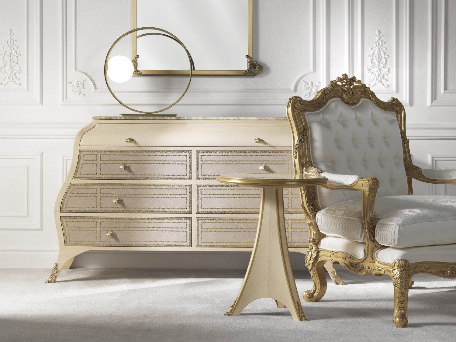 结构采用多层木材,枫木贴面。手工凿铸黄铜细节。装饰与古铜色金箔饰面。在浑浊的玛瑙中顶部。