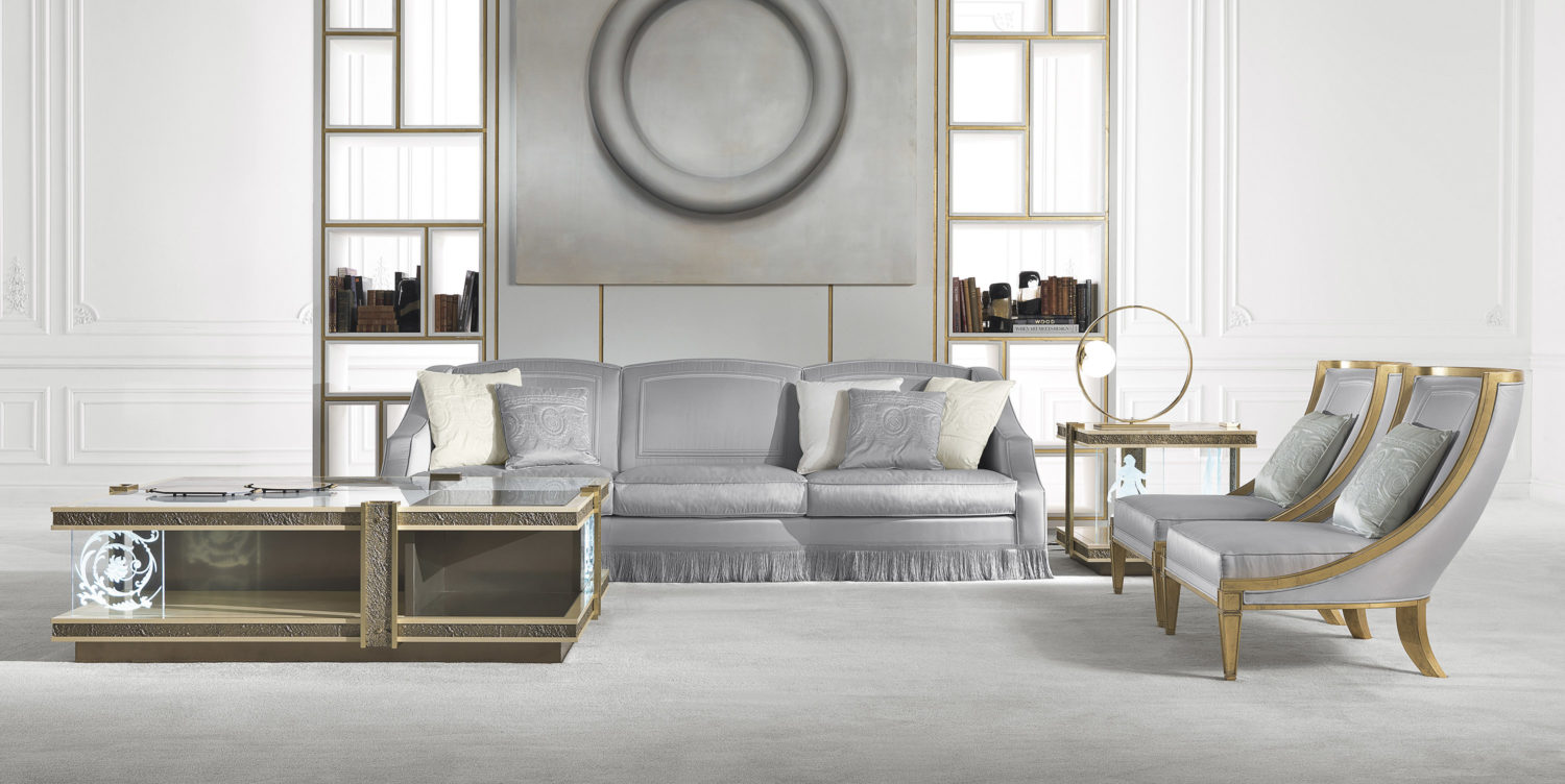 天然枫木结构的边桌。顶部是浅白色大理石。嵌件采用铸造黄铜制成。带有雕刻装饰元素的照明眼镜。
