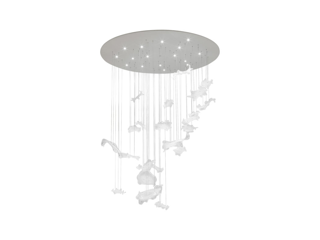 吊灯,带有悬挂装饰元素的穆拉诺玻璃制成,具有克拉克雷特效果。上部圆板带聚光灯。