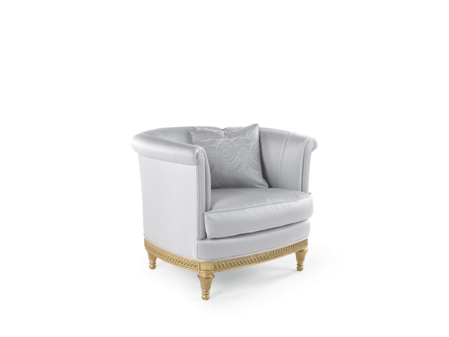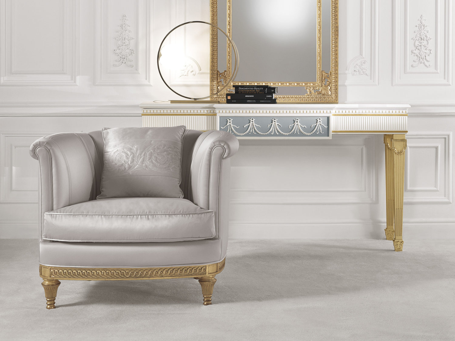 扶手椅,结构采用实心杨木。泡沫填充。织物内饰,浮雕刺绣。底座采用手工雕刻的山毛榉木,带有古色古香的金色饰面。