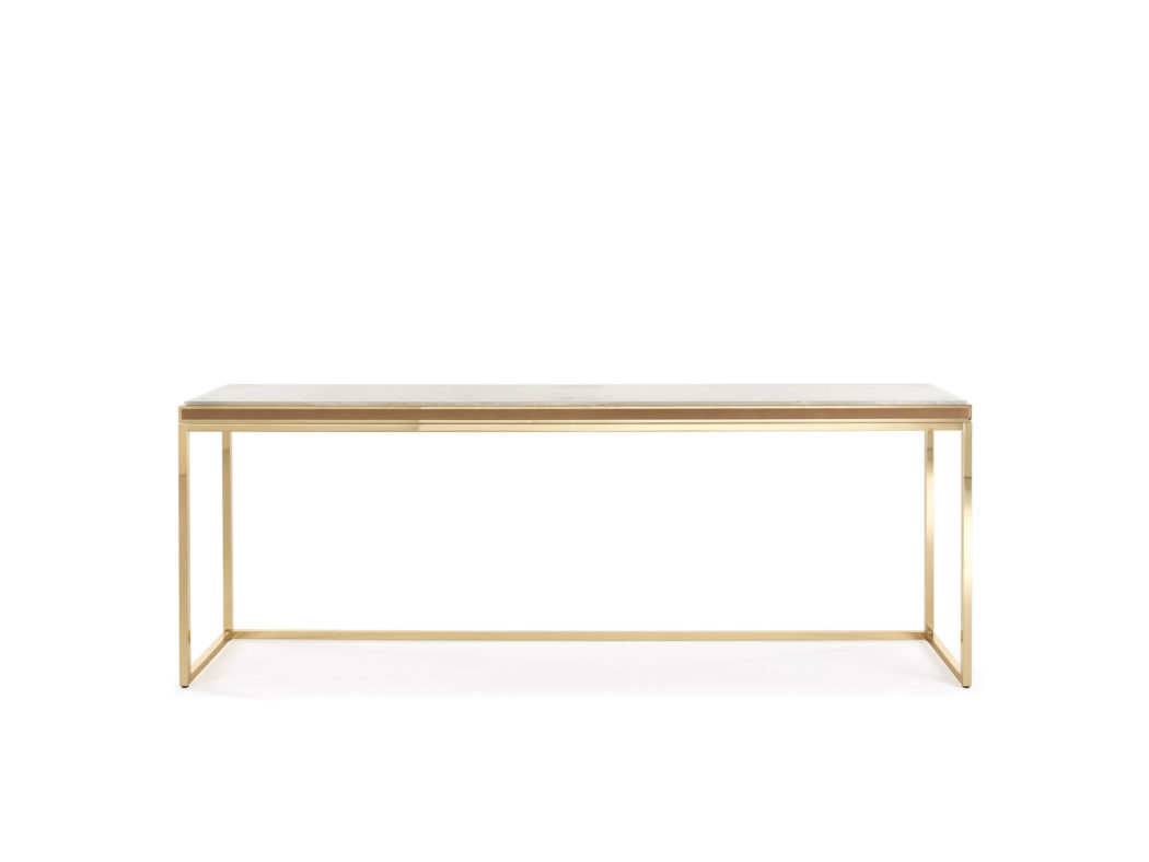 控制台采用黄铜结构,具有光泽的表面处理。雕刻框架。顶部是白色纳米比亚犀牛大理石。