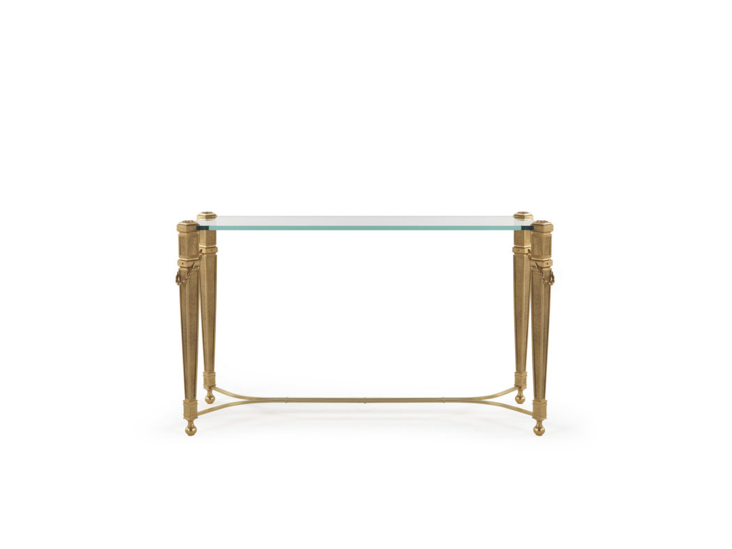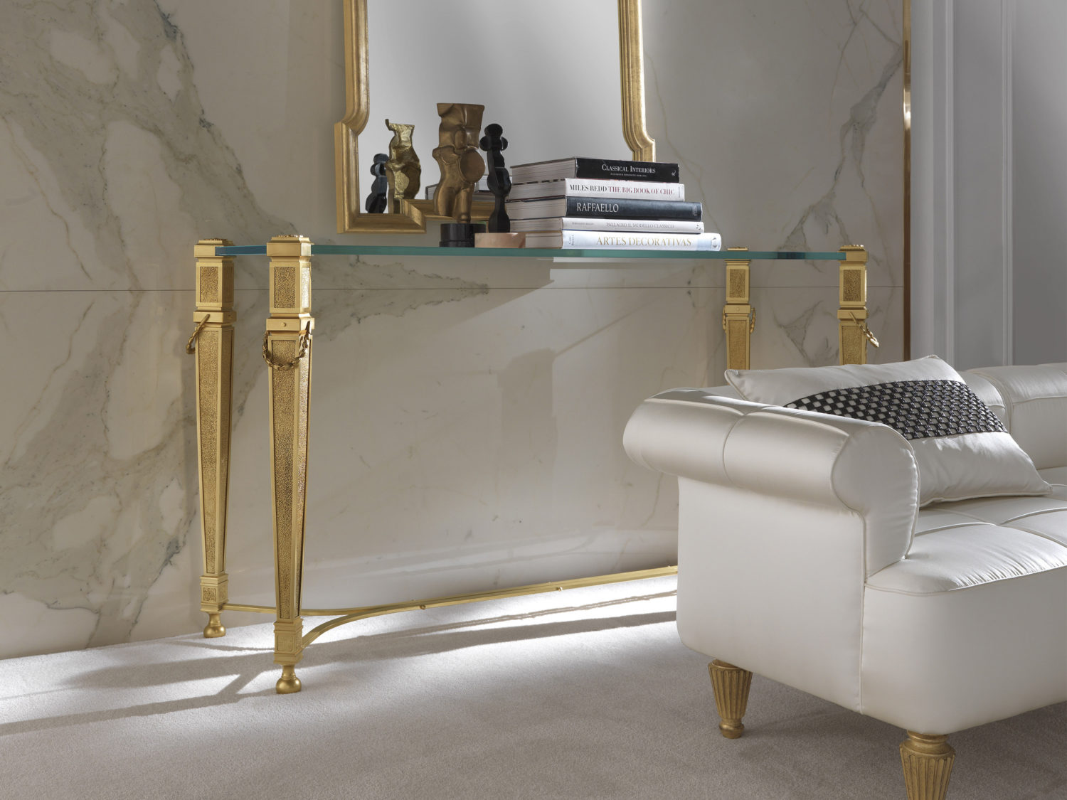 控制台,金属结构,金色饰面。失蜡铸造的装饰元素。顶部是超轻玻璃。
