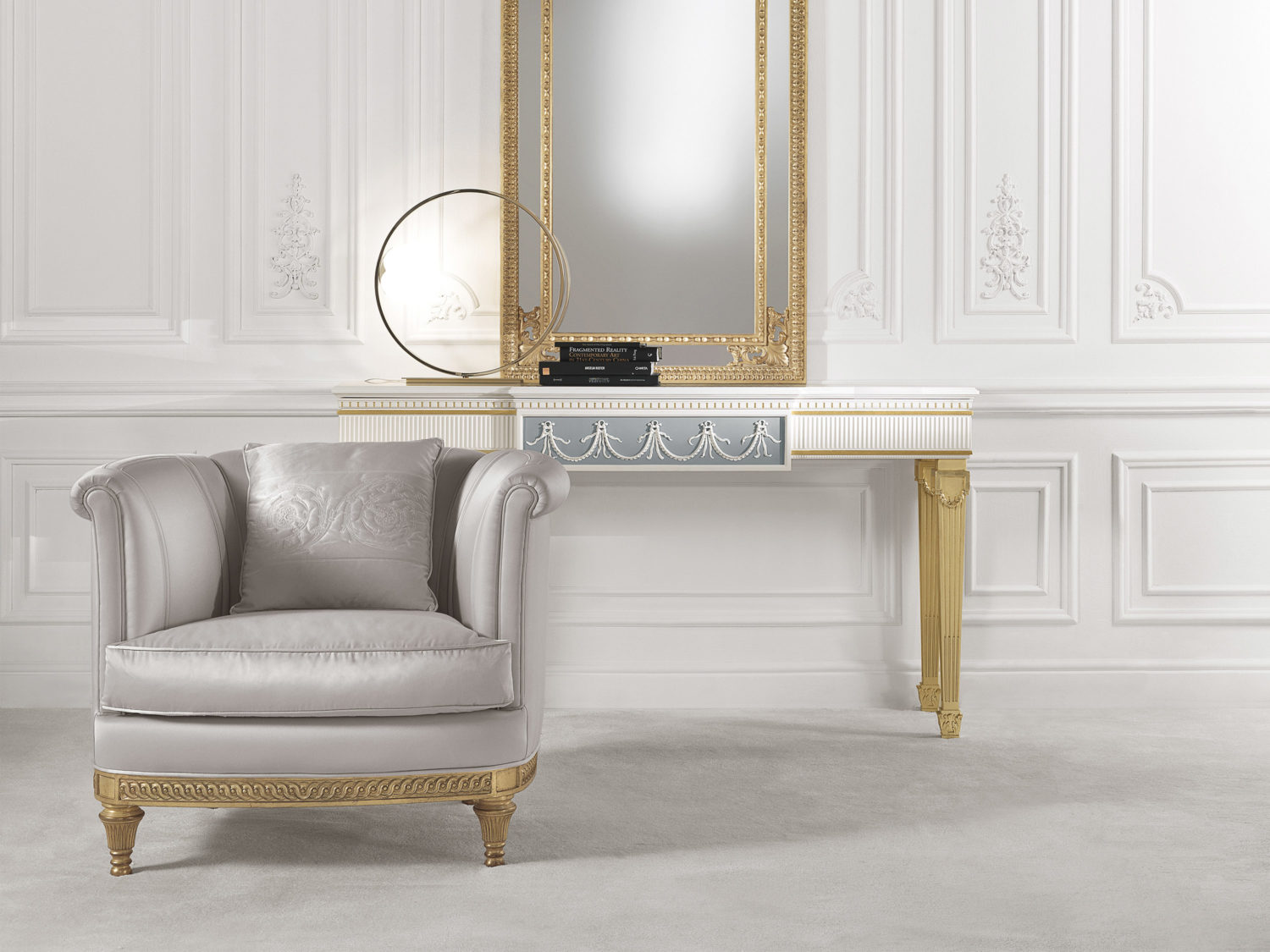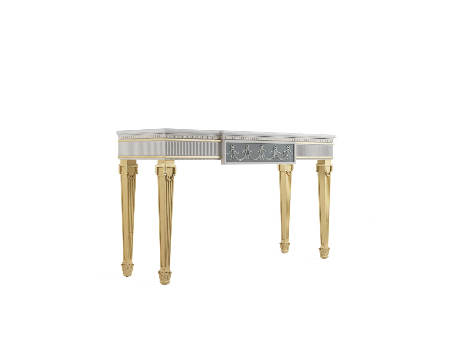 控制台采用实心山毛榉木结构。韦奇伍德陶瓷风格的装饰。白色和灰色漆面,带有饼干瓷器效果和哑光闪亮的金箔。