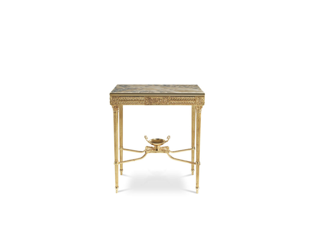 边桌采用失蜡铸造黄铜结构。木腿,有光泽的金色饰面。在浑浊的玛瑙中顶部。