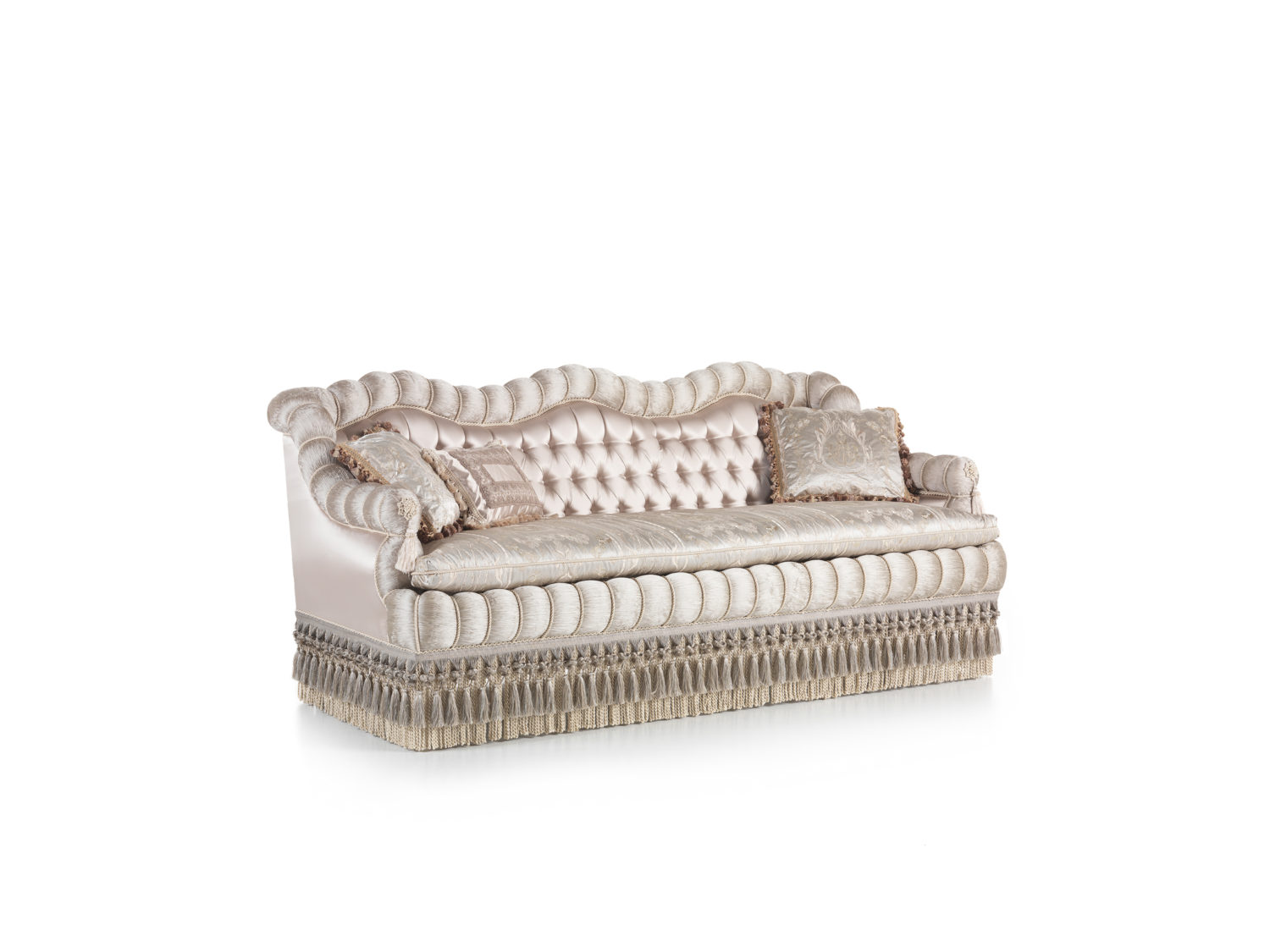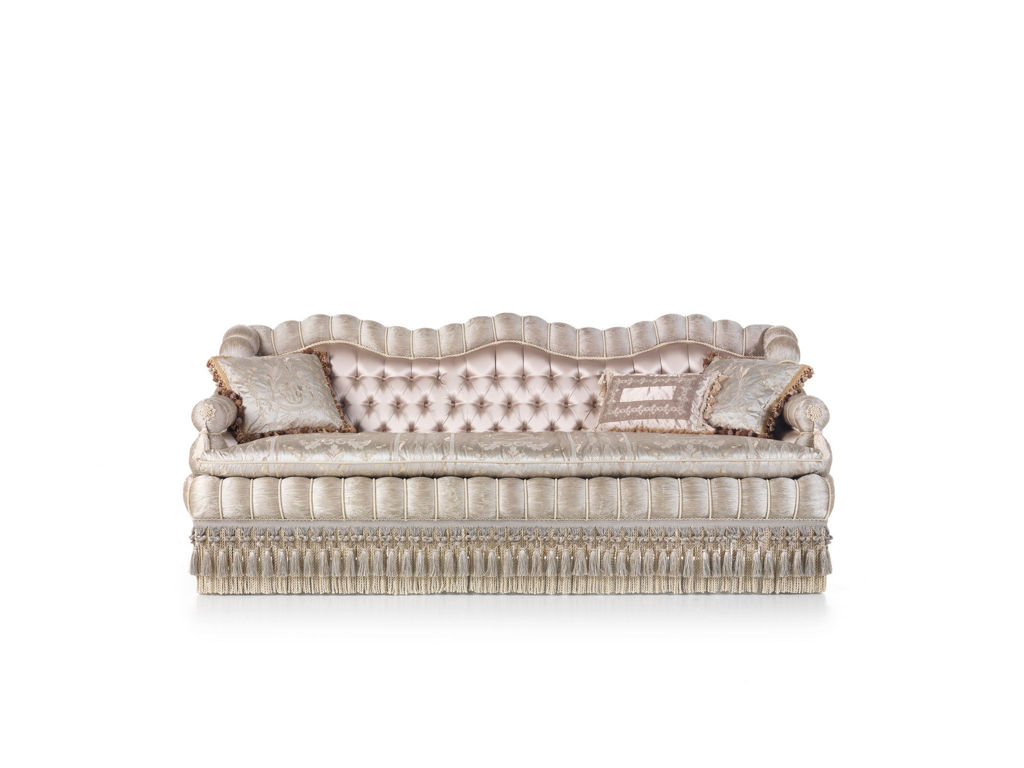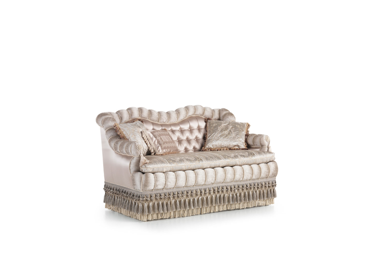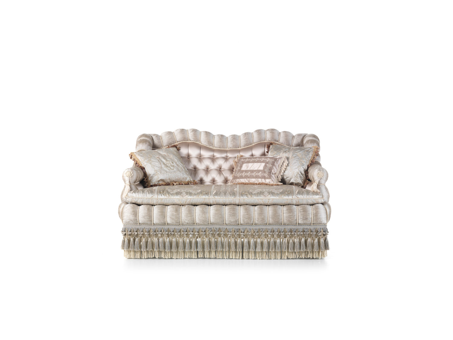 山毛榉木结构沙发。泡沫填充。织物内饰,靠背上饰有卡皮通内。N° 2 个枕头 50X50 厘米, N° 2 个枕头 30X50 厘米随附。