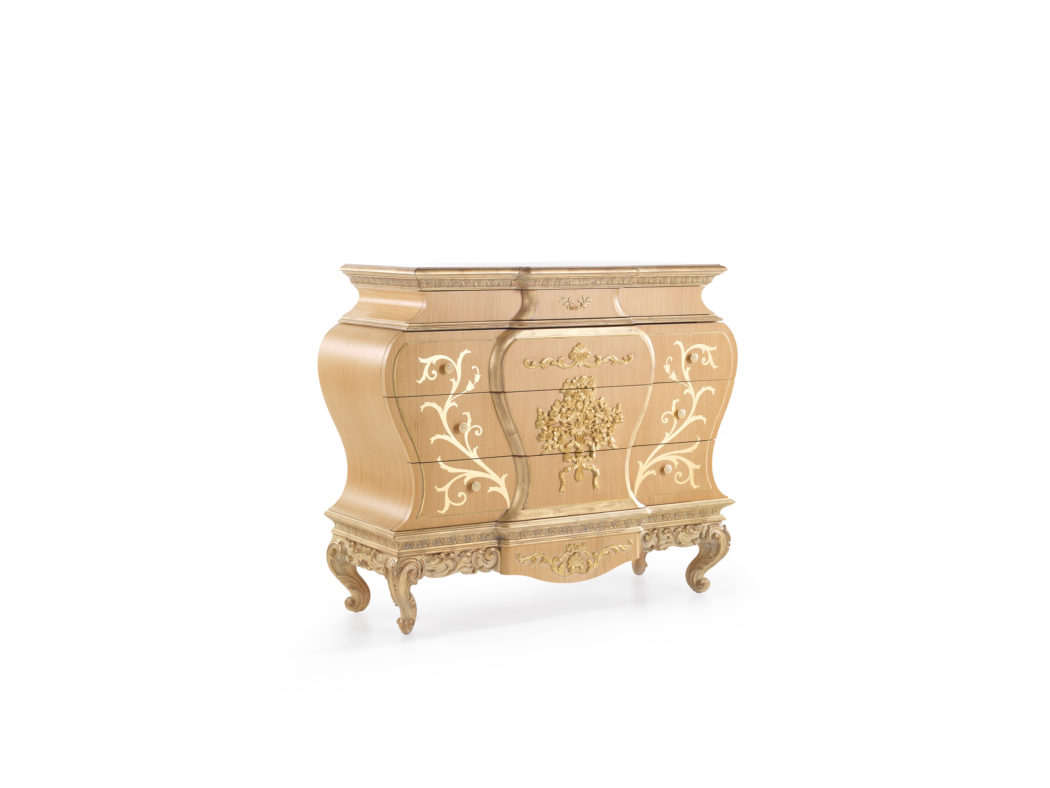 五斗抽屉,多层木结构,浅橡木和金色饰面。带金色装饰的抽屉。