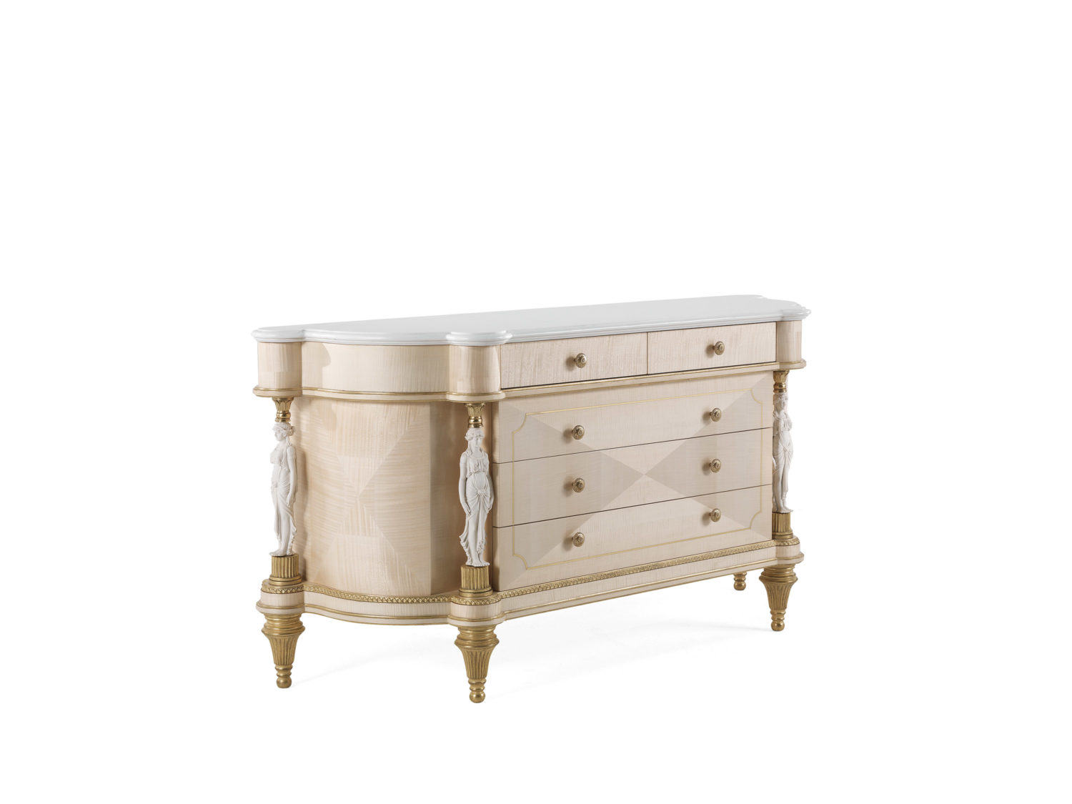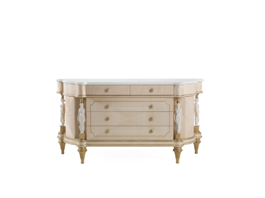 抽屉柜,结构采用弯曲的多层枫木结构。黄铜型材。细节与古色古香的金色饰面。比斯基特瓷像。顶部是浅白色大理石。也可用于新古典主义列。