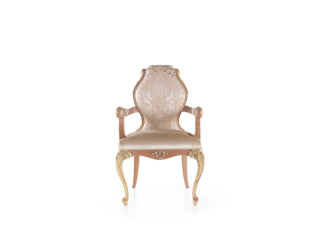 带扶手的椅子,采用手工雕刻的山毛榉木结构,浅橡木和金色饰面。泡沫填充。织物内饰。