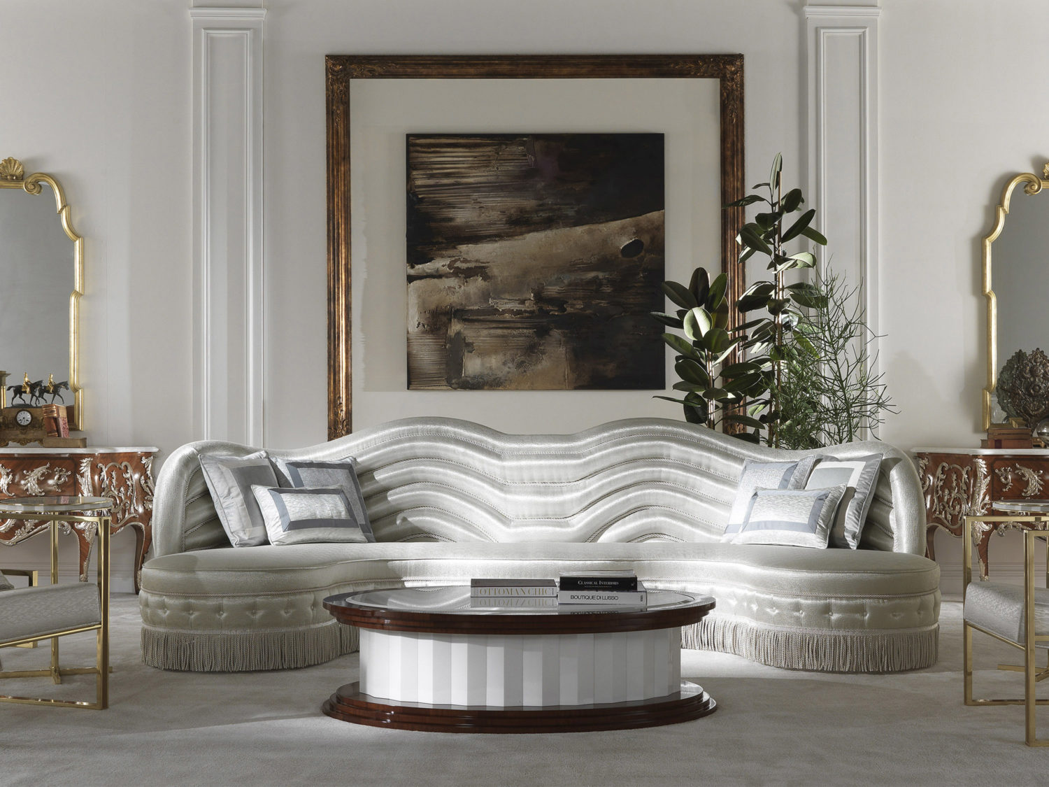 中央桌子,采用多面桃花心木结构。柱子和顶部采用白色萨索斯大理石。