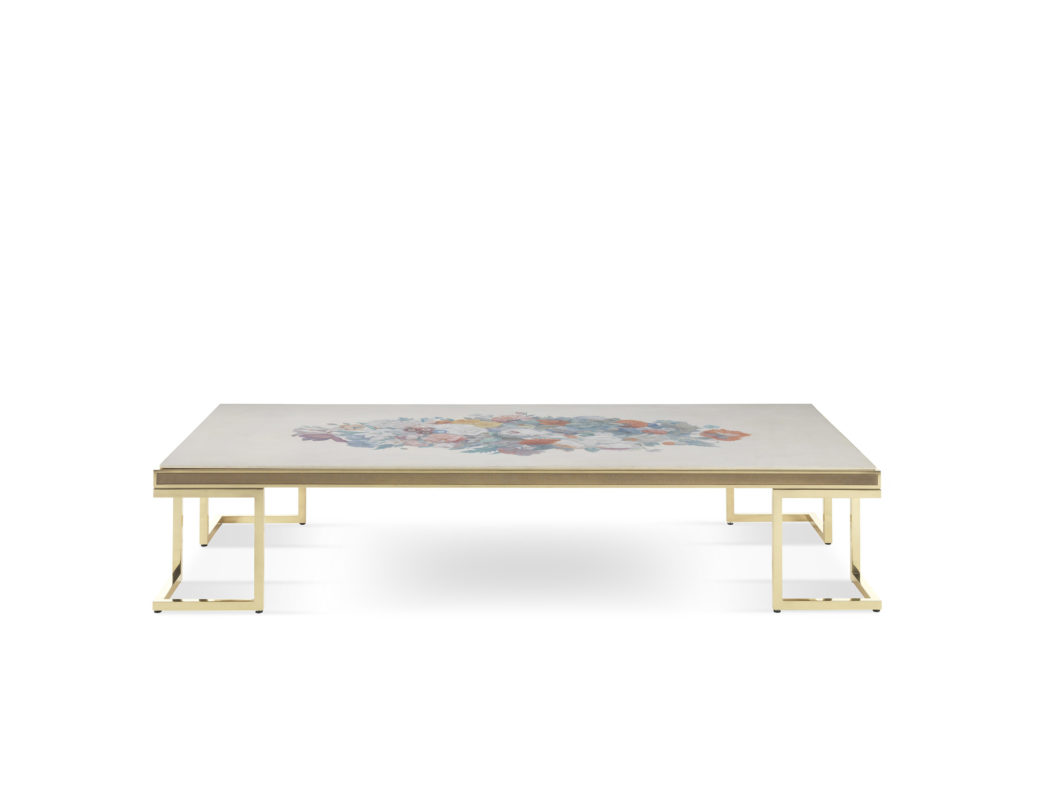中央桌子,结构有光泽黄铜,刻有框架。顶部采用木材,带有古董白色饰面和手工装饰。