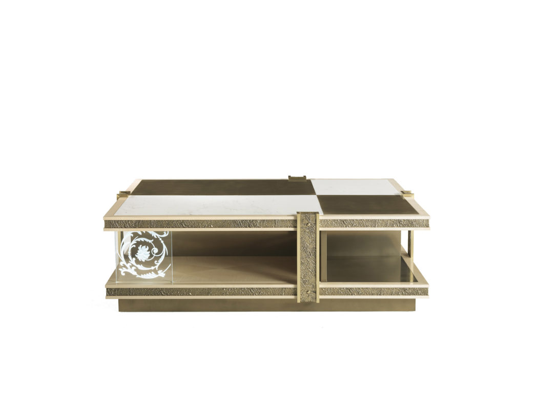 中央桌子,结构为天然枫木。顶部饰有亮白色大理石和液态金属饰面的元素。嵌件采用铸造黄铜制成。带有雕刻装饰元素的照明眼镜。