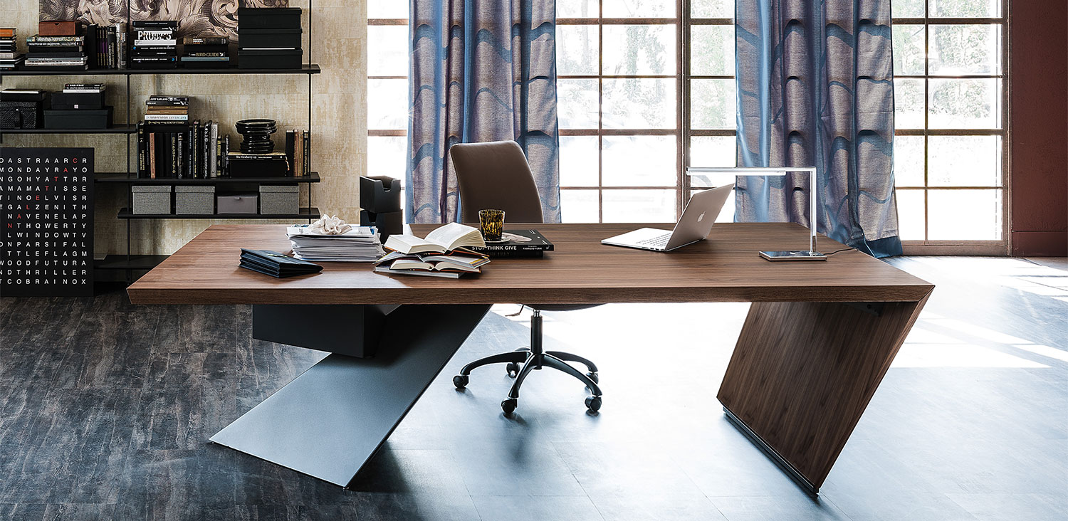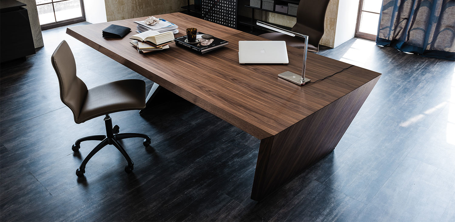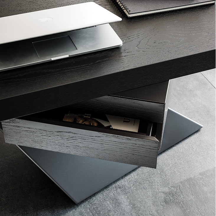书桌和抽屉采用卡纳莱托胡桃木 (NC)、传统橡木 (HR) 或开孔哑光黑色榆木 (OLM73) 制成。石墨 (GFM69) 压花漆钢腿。根据样品卡的皮革垫。在 215x100 版本上,抽屉可以固定在桌子的两侧,在 260x120 版本上,它只能面向最短边固定。