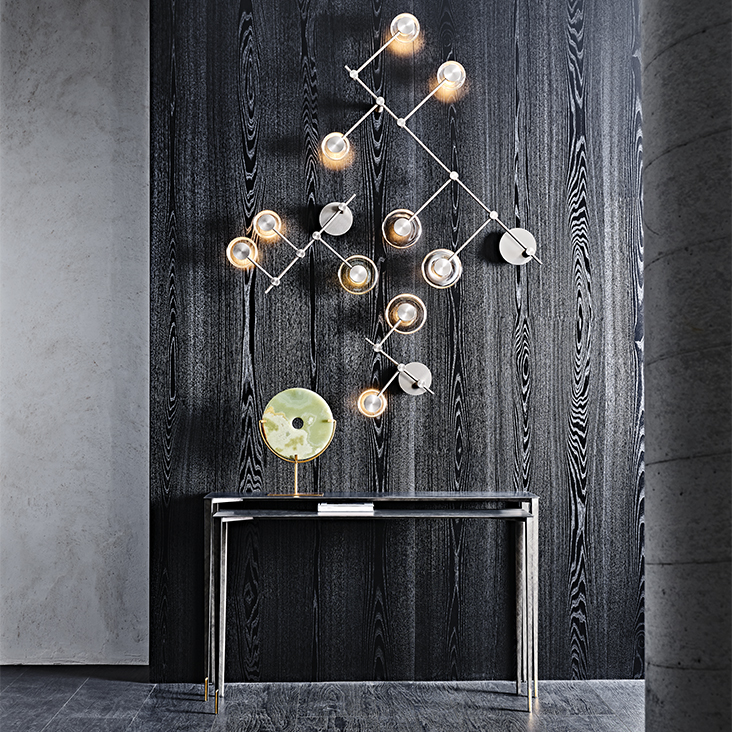 这对 Etoile设计的控制台桌因其优雅和轻盈而脱颖而出。细长的腿和两个高度的顶部之间的交叉点创造了一种编舞效果,增强了精致的饰面和黄铜细节。房子里的任何房间都被这些现代控制台重叠产生的光影对比所点缀。