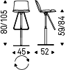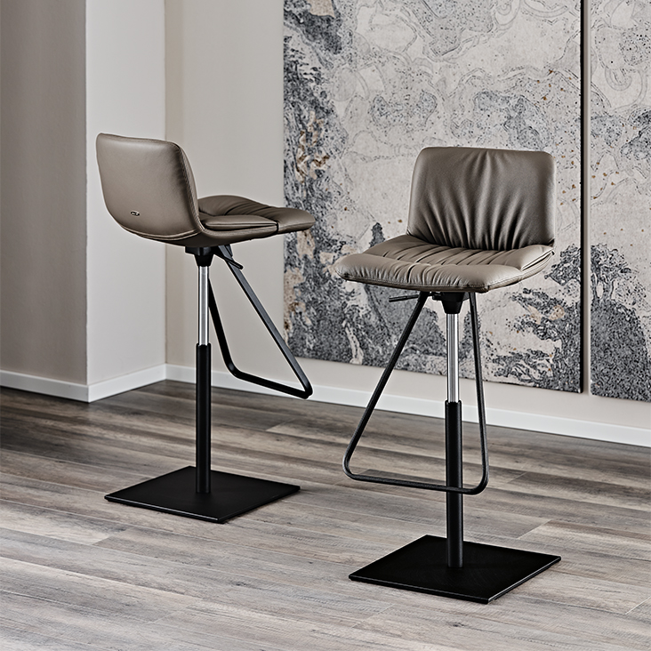可旋转且高度可调的凳子,配有缎面不锈钢底板和立柱、脚踏板和镀铬钢 (08) 气体活塞或黑色 (GFM73) 压纹漆钢底板和脚踏板和镀铬钢 (08) 气体活塞. 框架覆盖织物、合成牛巴革、合成皮革或根据样品卡的软皮革。
