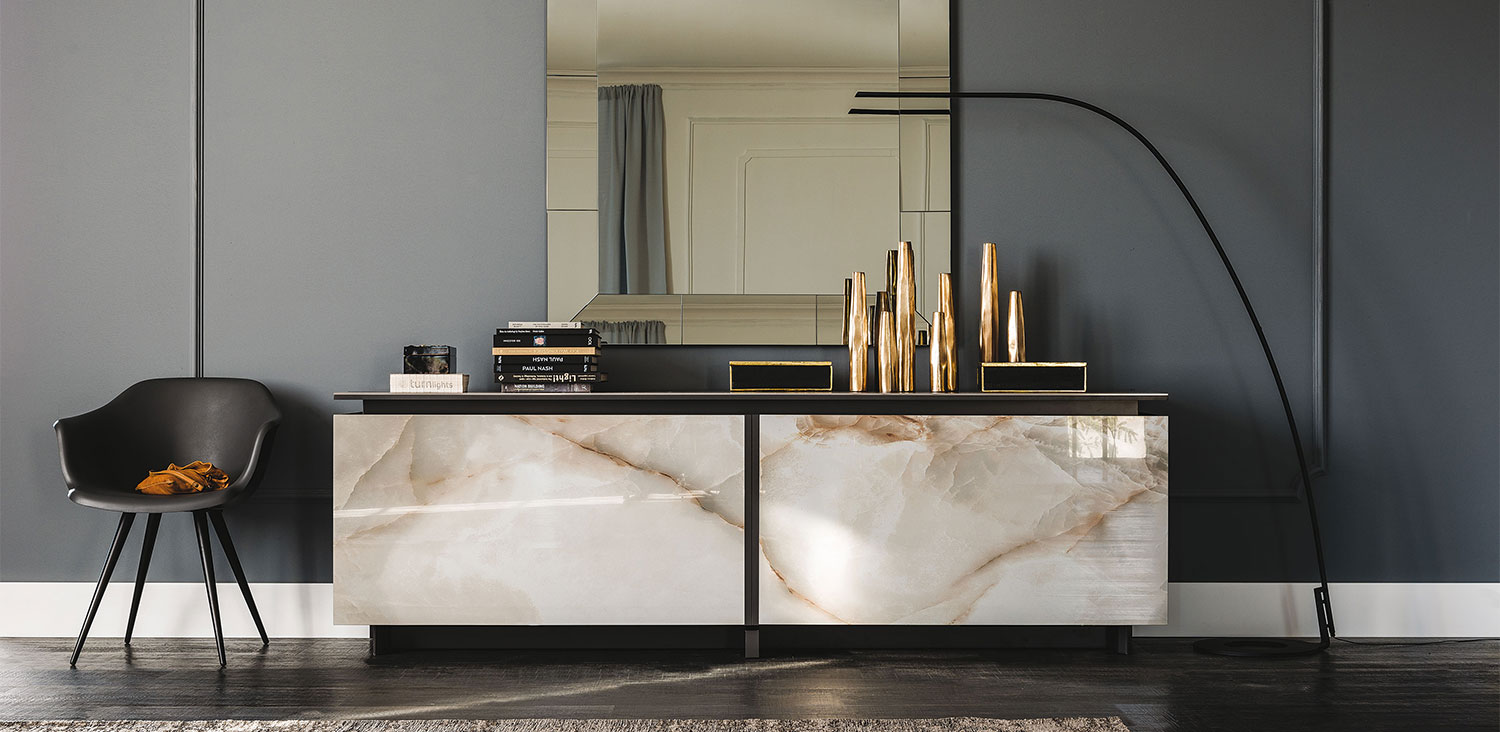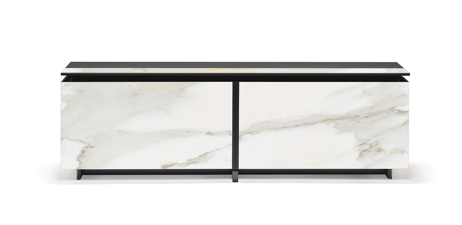 带推拉门的餐具柜,顶部插入陶瓷 Marmi Alabastro (KM02)、Supreme (KM03)、Ardesia (KM04)、哑光 Golden Calacatta (KM05)、亮面 Golden Calacatta (KM06) 哑光 Portoro (KM07)、亮面 Portoro (KM08) )、亮面撒哈拉黑 (KM09)、Emperador (KM10)、马卡鲁 (KM11)、角砾岩 (KM12) 或阿雷纳尔 (KM13) 和黑色 (OP17) 或哑光石墨 (OP69) 涂漆框架。透明玻璃内部搁板。
