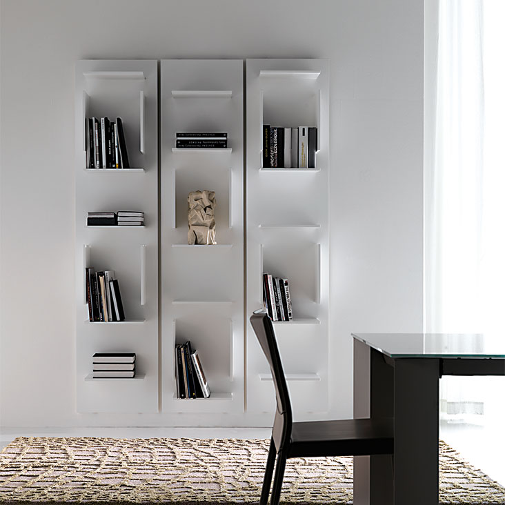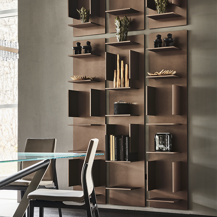 青铜 (GF15) 或白色 (GF71) 漆面压花木板组合式壁挂书柜。提供用于倒挂/倒挂的壁挂支架。