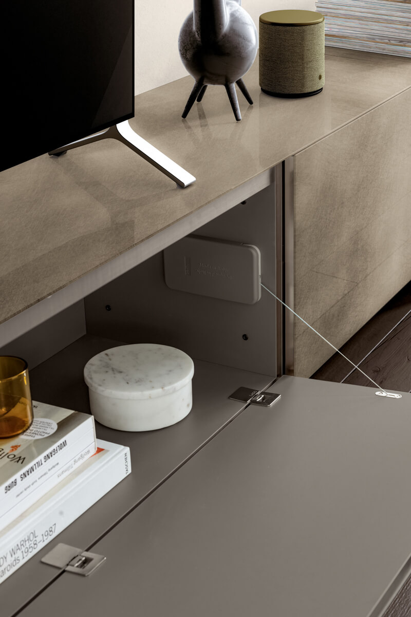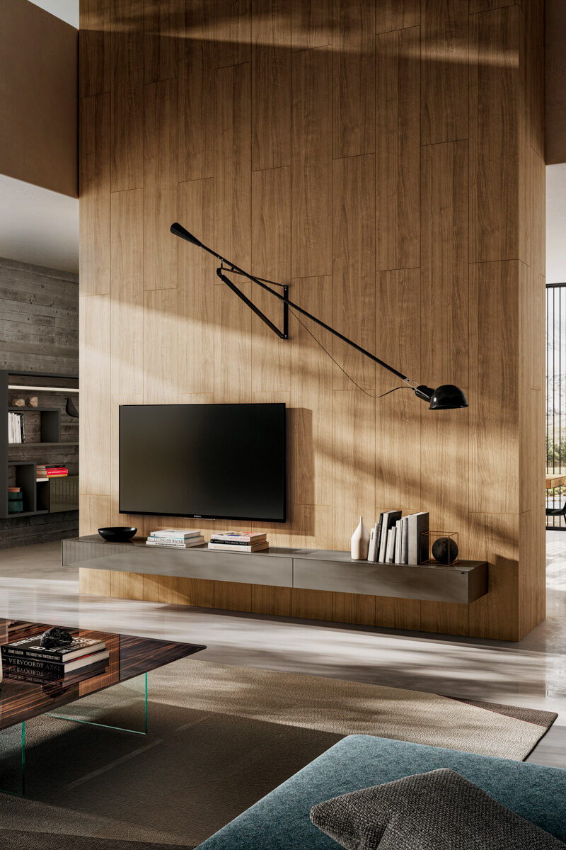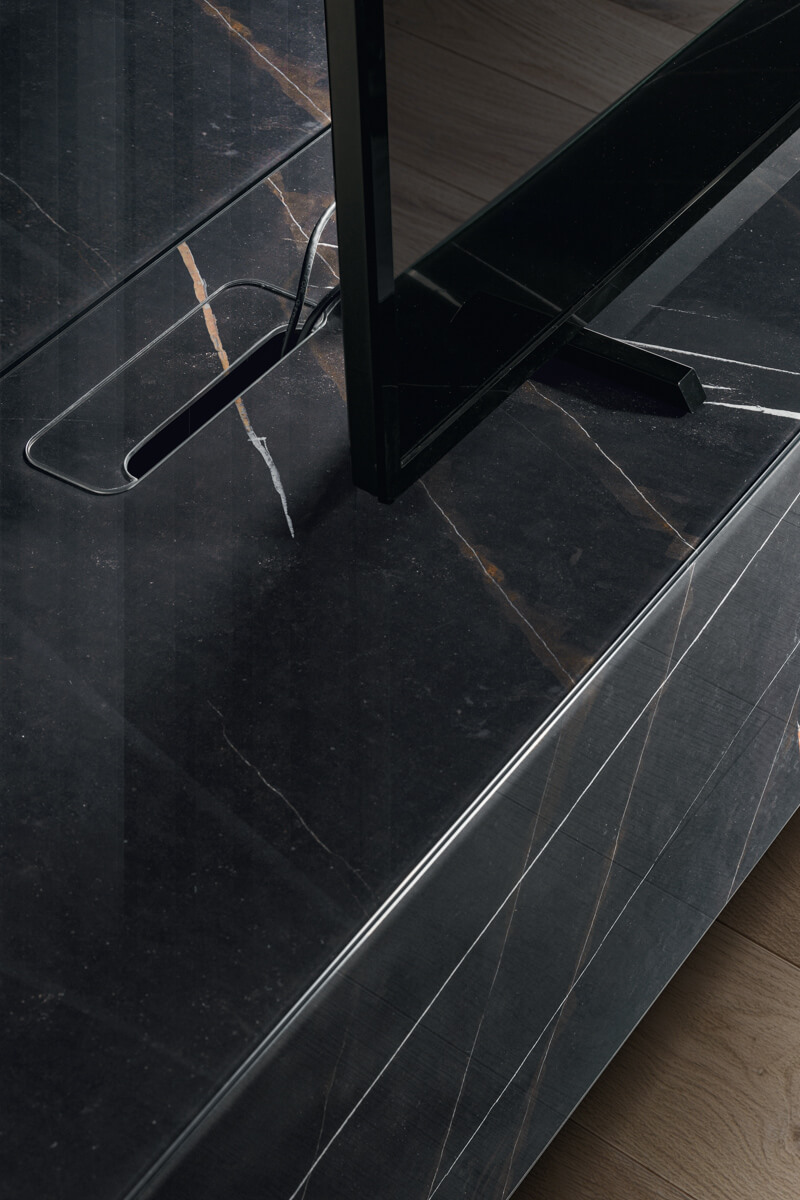 Materia TV Unit 的形式清洁使产品与任何室内风格都融为一体,在这个整体中恢复了玻璃的情感。由于 XGlass 的创新强度以及侧面、顶部和门之间大理石和木纹的连续性,定制表面的无限可能性为起居区增添了一丝优雅。Materia 可以悬挂在钛钢或锡钢的金属支架上,也可以挂在墙上。