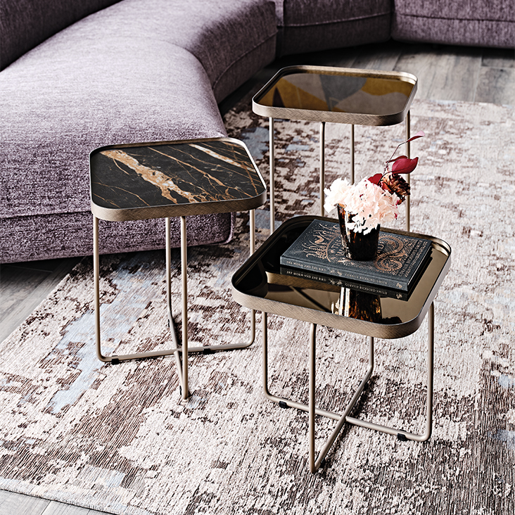 咖啡桌的框架为压纹钛 (GFM11) 或黑色 (GFM73) 漆钢框架,或底部为青铜和拉丝青铜顶框架。镜面青铜玻璃顶部。