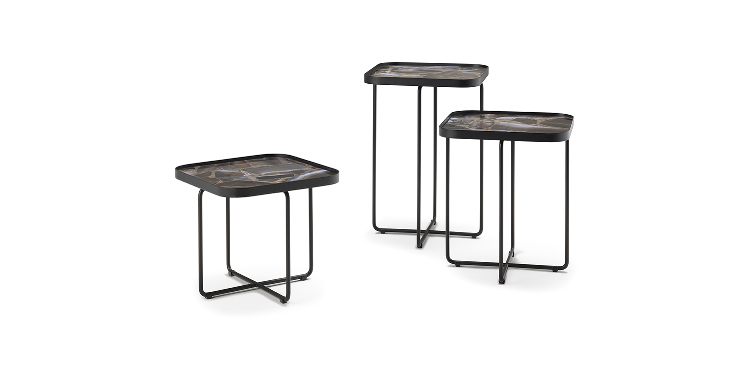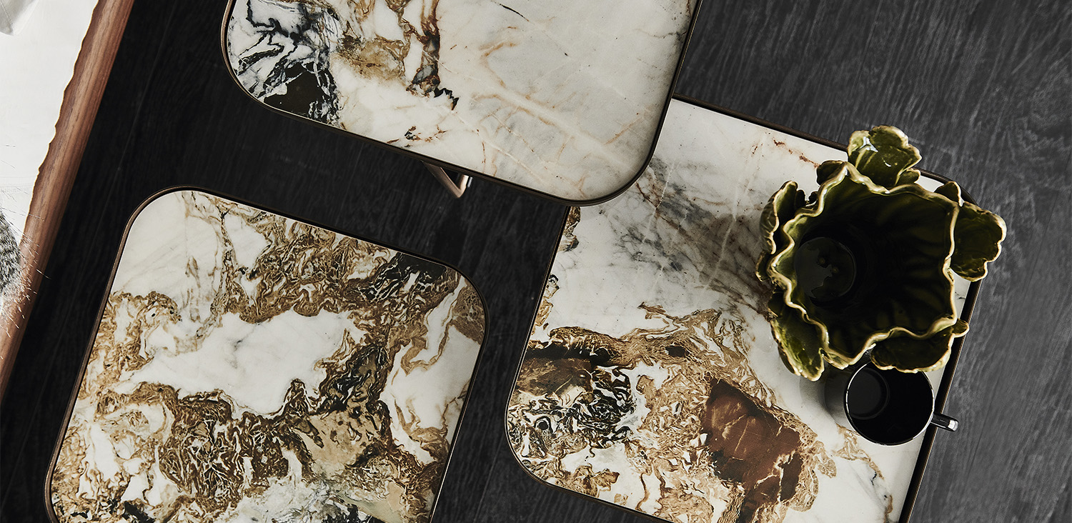 咖啡桌的框架为压纹钛 (GFM11) 或黑色 (GFM73) 漆钢框架,或底部为青铜和拉丝青铜顶框架。Marmi Alabastro (KM02)、Supreme (KM03)、Ardesia (KM04)、哑光 Golden Calacatta (KM05)、亮面 Golden Calacatta (KM06)、哑光 Portoro (KM07)、亮面 Portoro (KM08)、亮面 Sahara Noir (KM09)、Emper (KM10)、马卡鲁 (KM11)、角砾岩 (KM12)、阿雷纳尔 (KM13) 或 Zefiro (KZ20) 陶瓷台面。