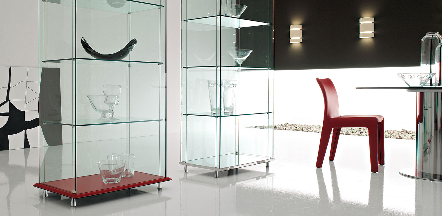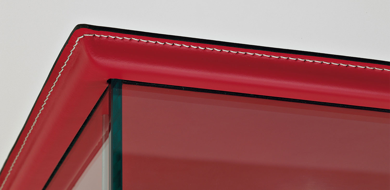 带镀铬 (08) 支脚的透明玻璃展示柜。顶部和底部采用抛光不锈钢或根据样品卡覆盖皮革。带led灯。最大容量:每个架子 kg 7。