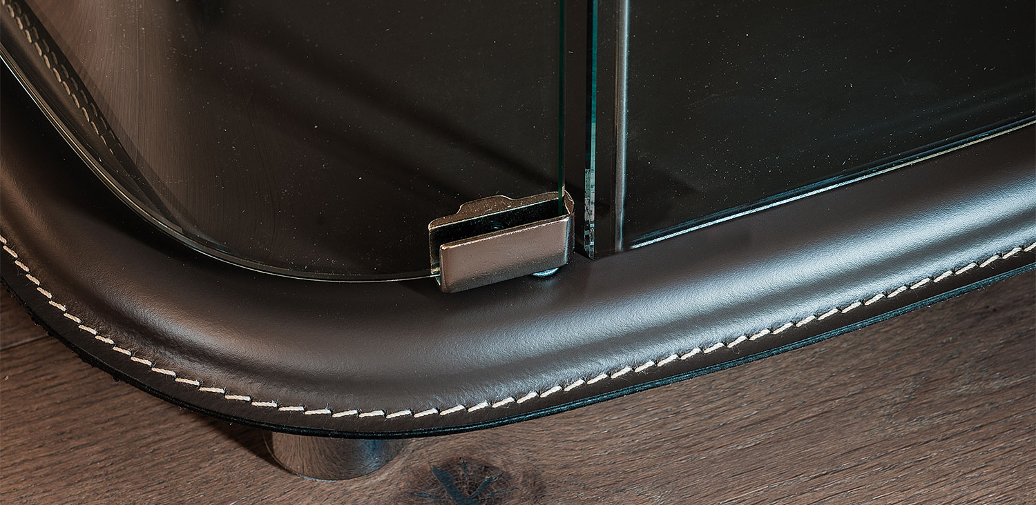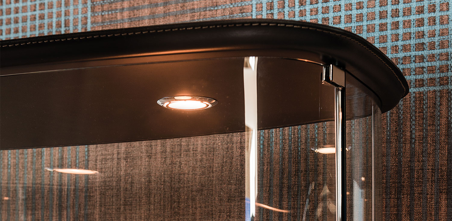 透明玻璃展示柜,顶部和底部均按照样品卡覆盖皮革。带2个led灯。最大容量:每层10公斤。