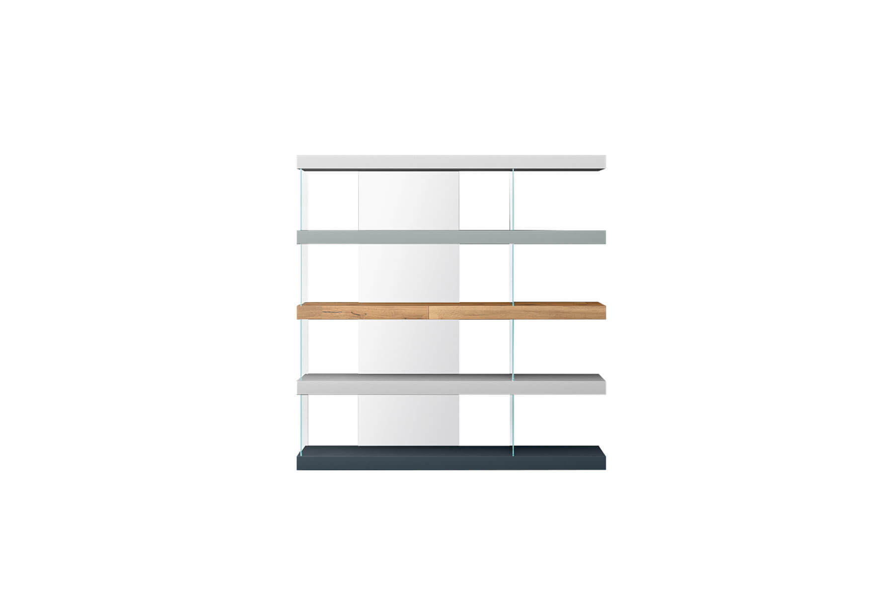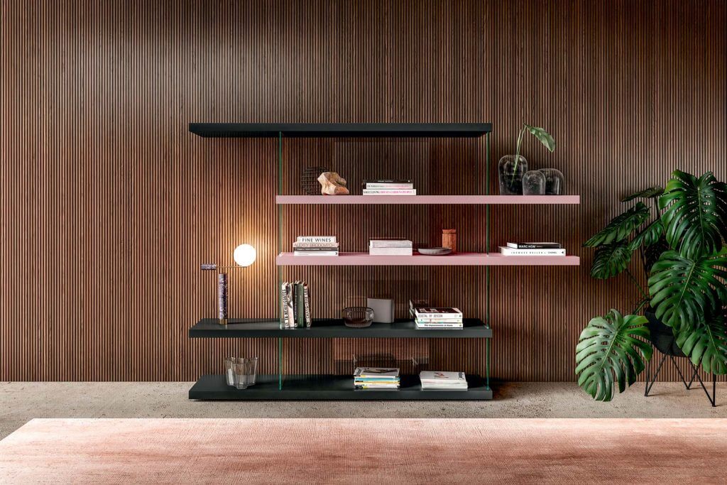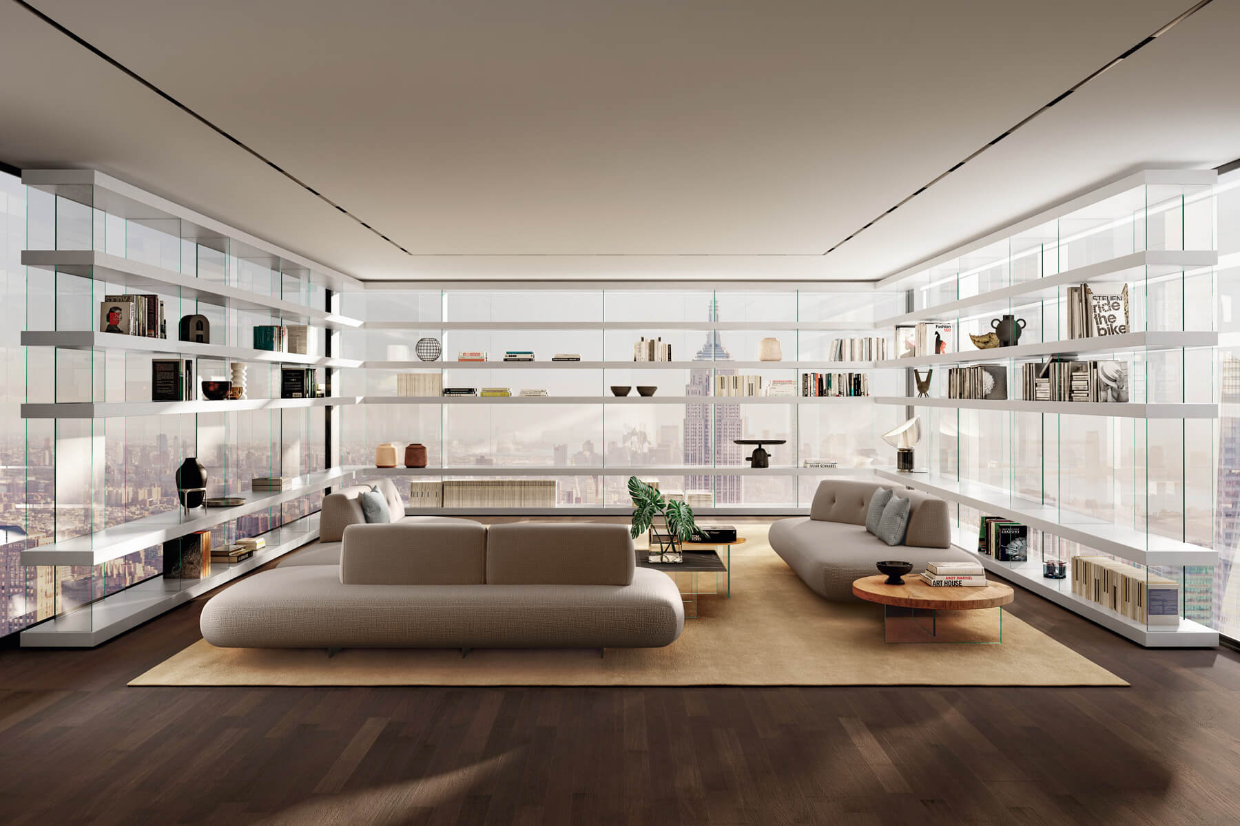 对空间的重新诠释,改变了满与空的关系。悬浮在玻璃支架上的Air书柜,仿佛漂浮在空中,让光线过滤进来,给环境带来极致轻盈的感觉。在透明的玻璃中,创建了非常厚的搁板和功能性容器,由隐藏的固定系统支撑,确保结构的稳定性和安全性。不受尺寸限制并位于房间中央的书柜成为一种建筑模仿物,将空间分隔到天花板。