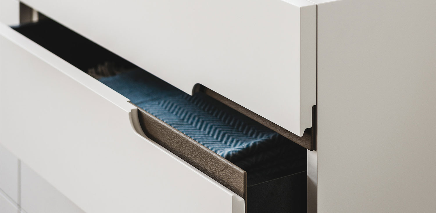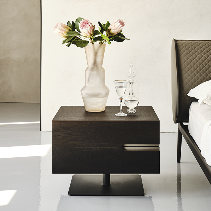 床头柜有两种尺寸和两种高度,带 2 个抽屉,梳妆台带 8 个抽屉,框架和面板采用牡蛎 (GF50) 或石墨 (GF69) 压花漆木,或卡纳莱托胡桃木 (NC) 或烧橡木 (RB)。根据我们的样品卡插入合成皮革或软皮革。带有石墨 (GFM69) 压花漆钢底座的版本。