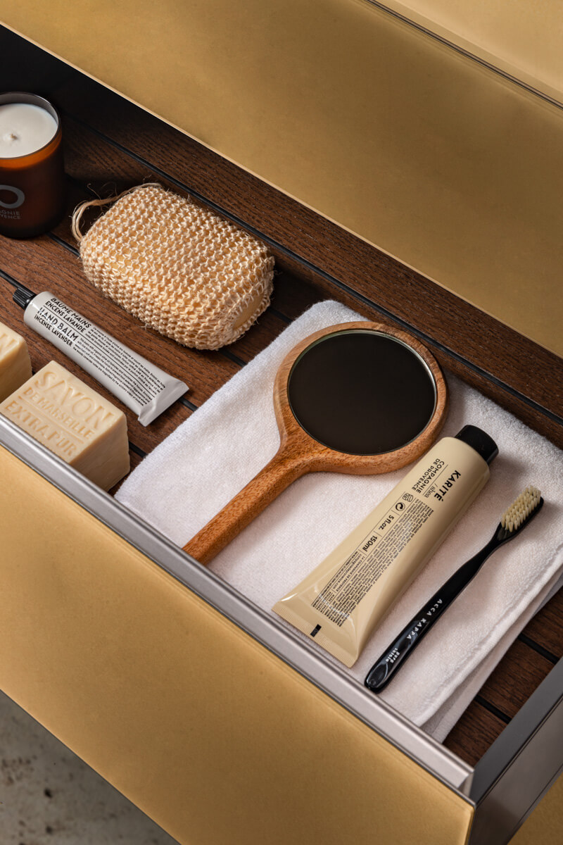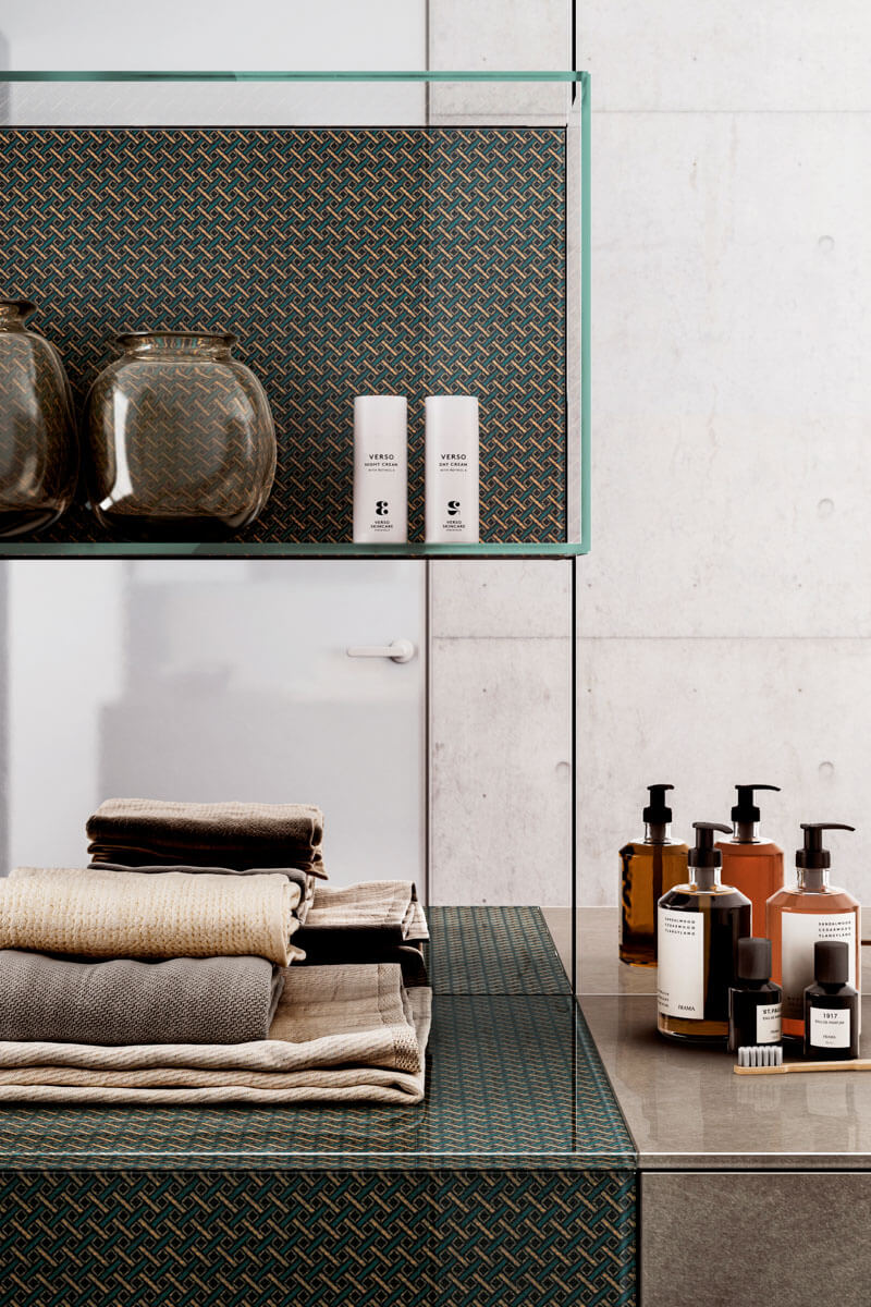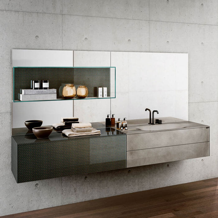 玻璃台面的热处理设计了一个弯曲而实用的洗脸盆,与 36e8 底座相结合,可实现多功能存储,以设计您自己的各种饰面和尺寸的空间。玻璃熔化并自行成型,以尊重其所集成底座的完美体积。它有所有 Lago 颜色和 XGlass 金属可供选择。