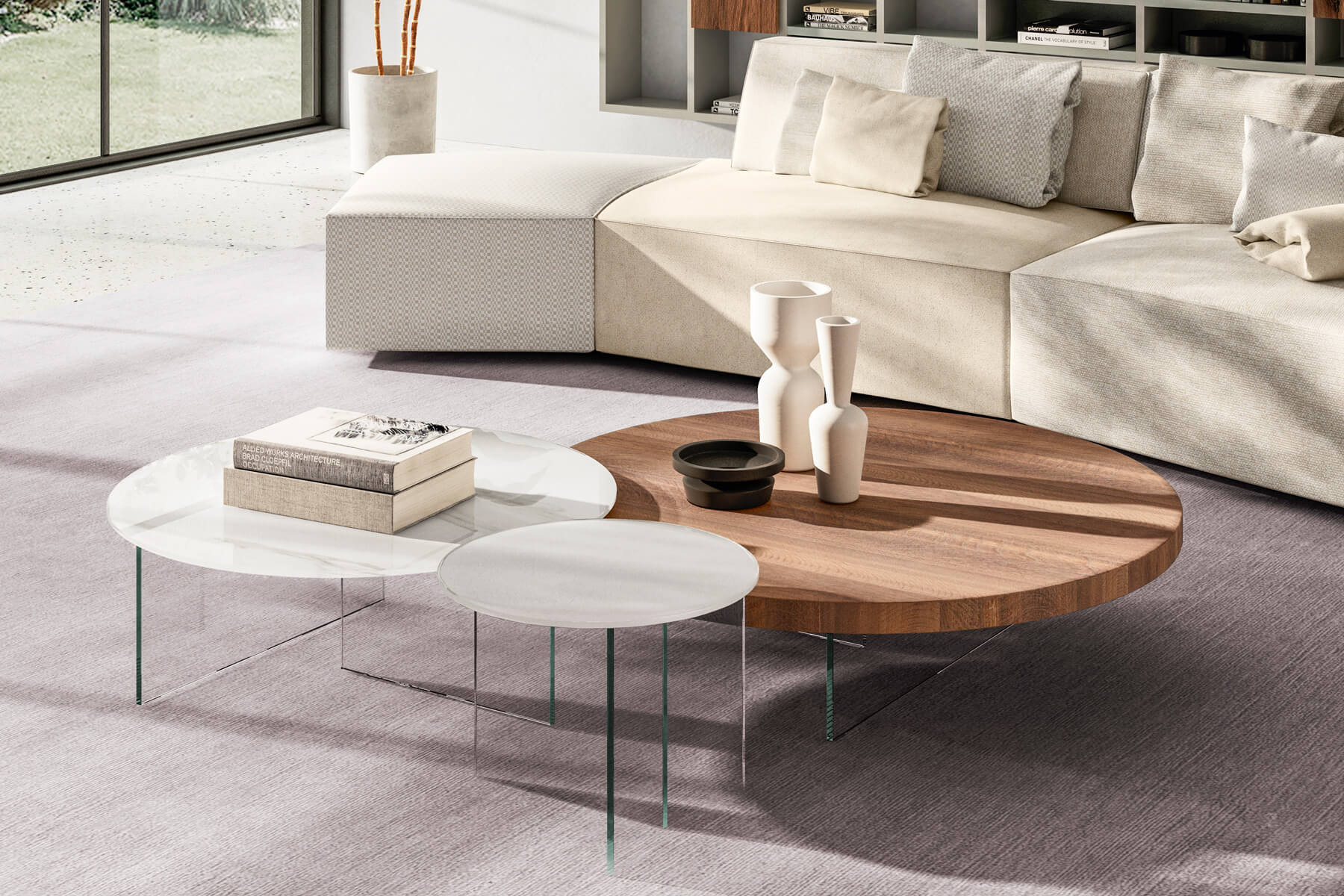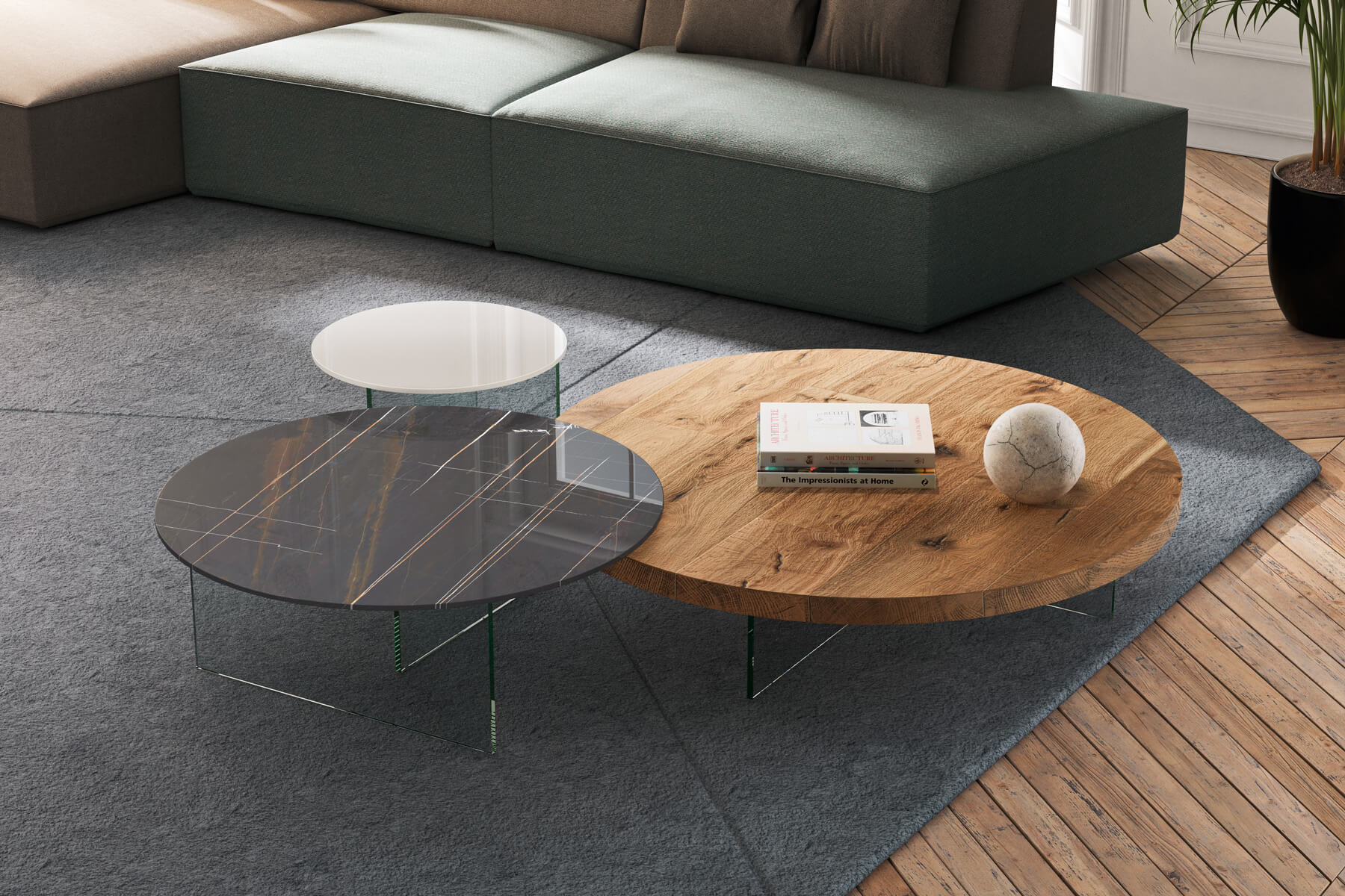 Air Rotondo 咖啡桌是一款造型优雅且必不可少的咖啡桌。在大尺寸的选择和完成的顶部允许您创建一个圆形茶几和谐地与拉戈家具等元素的对话。