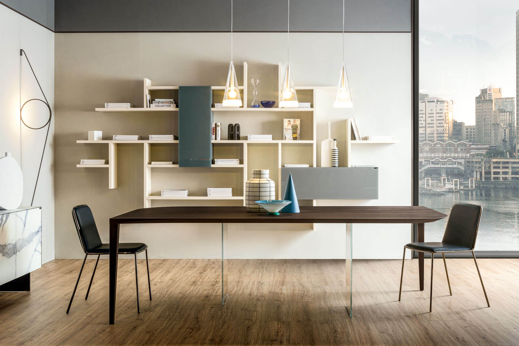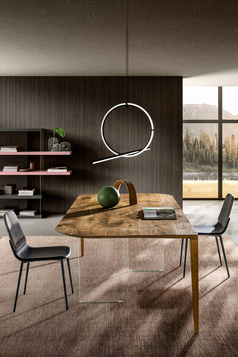 仅在两个支撑件上形成的单一材料流:这是 P&J 工作台的主要特征。薄顶部的特点是圆润的边缘,和谐地连接到顶部相对两端的木腿,从而创造出和谐流畅的连续线条。结构的橱柜制作以及位于顶部中央下方的两个不易察觉的玻璃腿的存在,保证了坚固性和抵抗力,增加了抗冲击和抗冲击性。