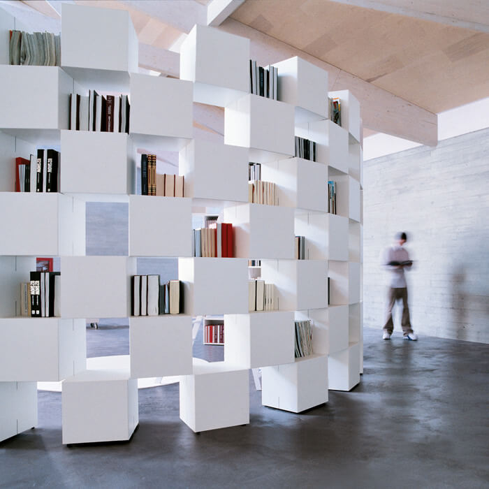 释放创造力的模块化图书馆 Net 书柜由一个每边 40 厘米的立方体网络组成,可以无限组合,为组合高度可定制的模块化书柜提供了极大的自由。 无论大小,网都可以轻松放入任何客厅,也可用作分隔书柜,从而为房子创造新的区域。