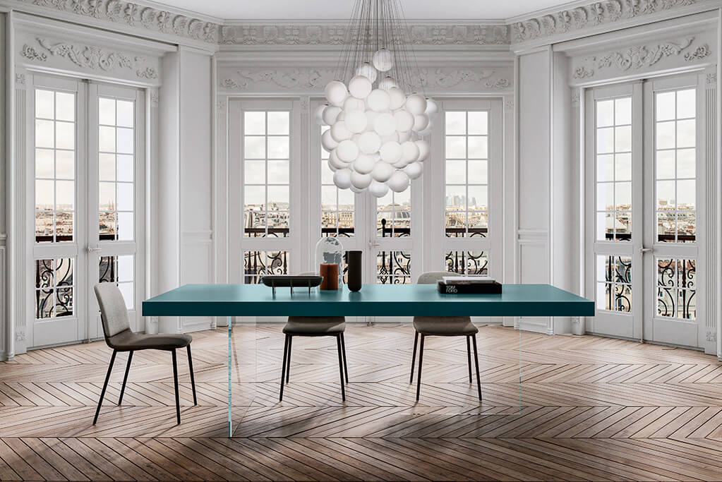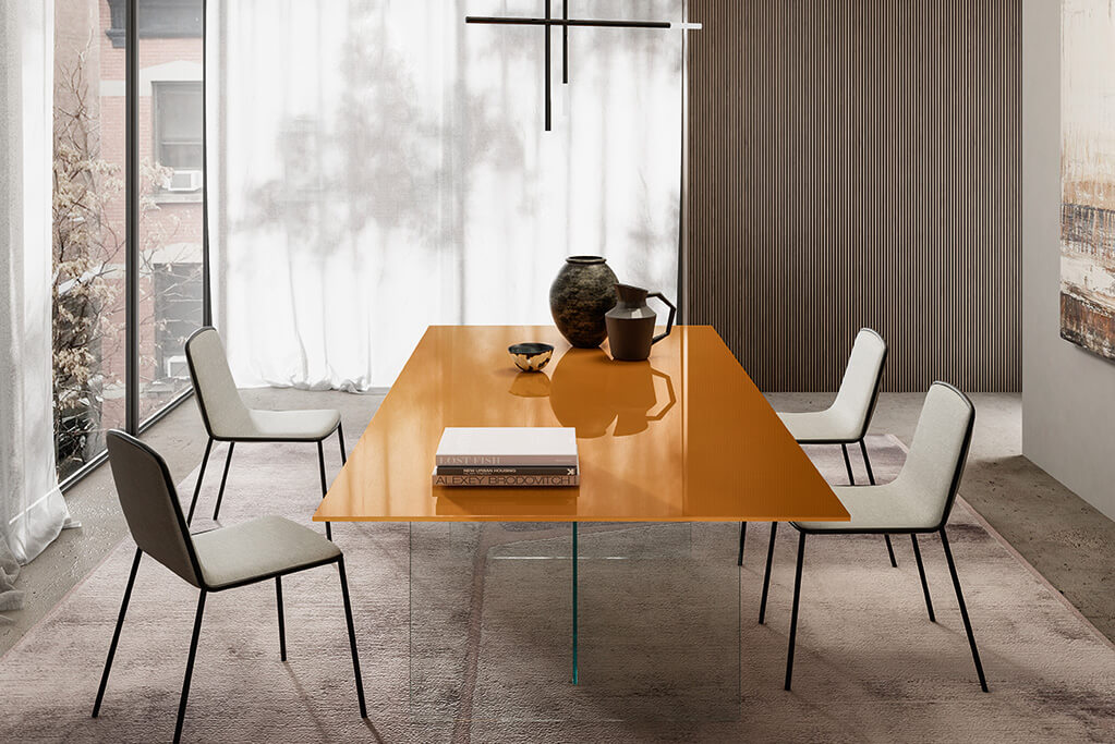 桌面可以选择不同的饰面,每种饰面都能够以个性化的方式描绘室内:从怀尔德伍德橡木的温暖到彩色玻璃的精致,Air 桌子以原始方式适合不同的环境和风格。