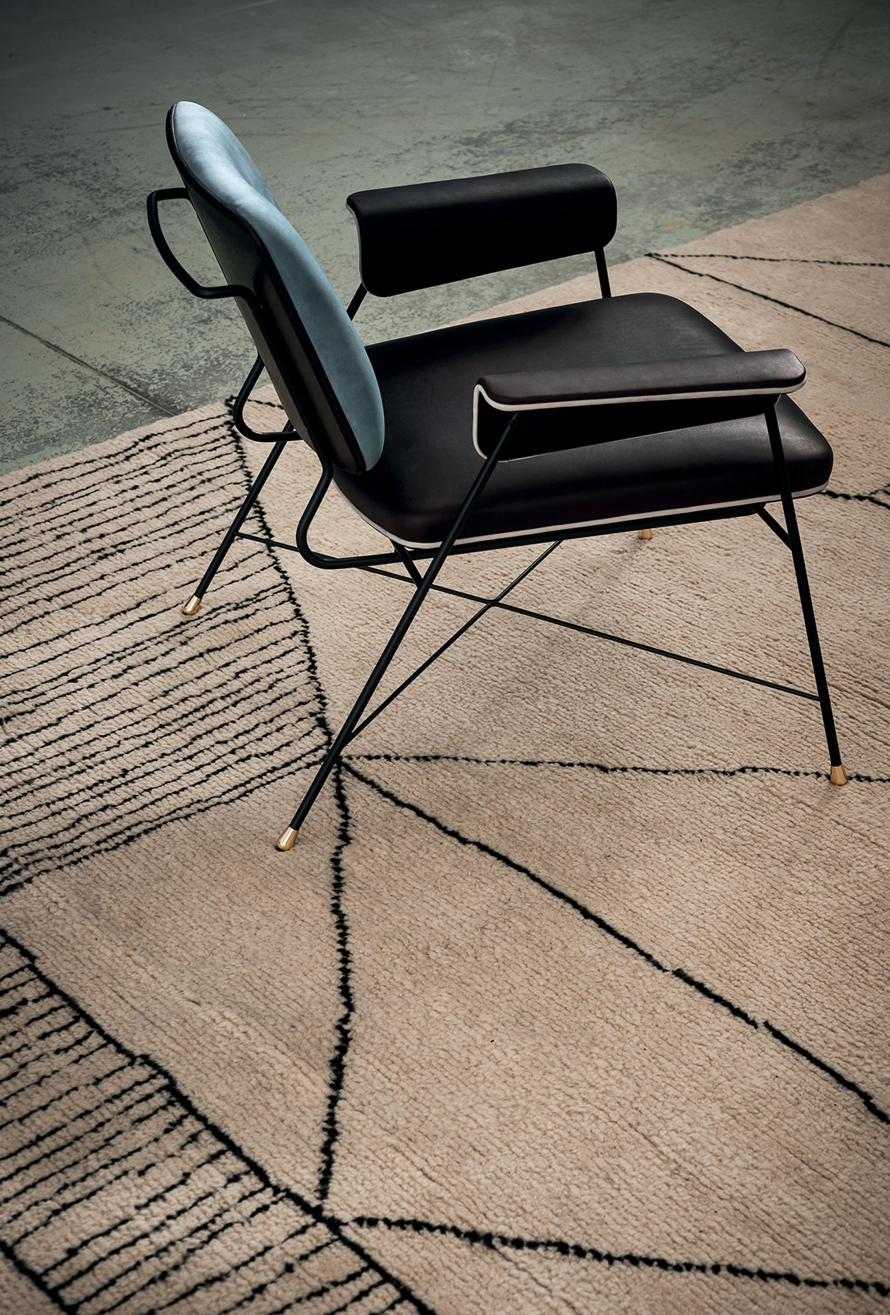 这块地毯完全手工编织在传统的垂直织机上,采用手工纺制的羊毛,具有 900 年初柏柏尔-摩洛哥地毯的特点。整理过程非常精细:在第一次刮胡子和洗手之后,每块地毯都经过处理,以创造出独特的产品:一个熟练的工匠用剪刀在表面上工作,以便给它原始地毯的典型不规则之处。一边是缝制的,与设计图案相匹配,并装饰有羊毛缝合。在另一边,边缘是一个接一个地编织,按照老柏柏尔地毯的风格。b/w 版本通过使用非染色羊毛进行,而其他版本则涉及使用植物染料。
