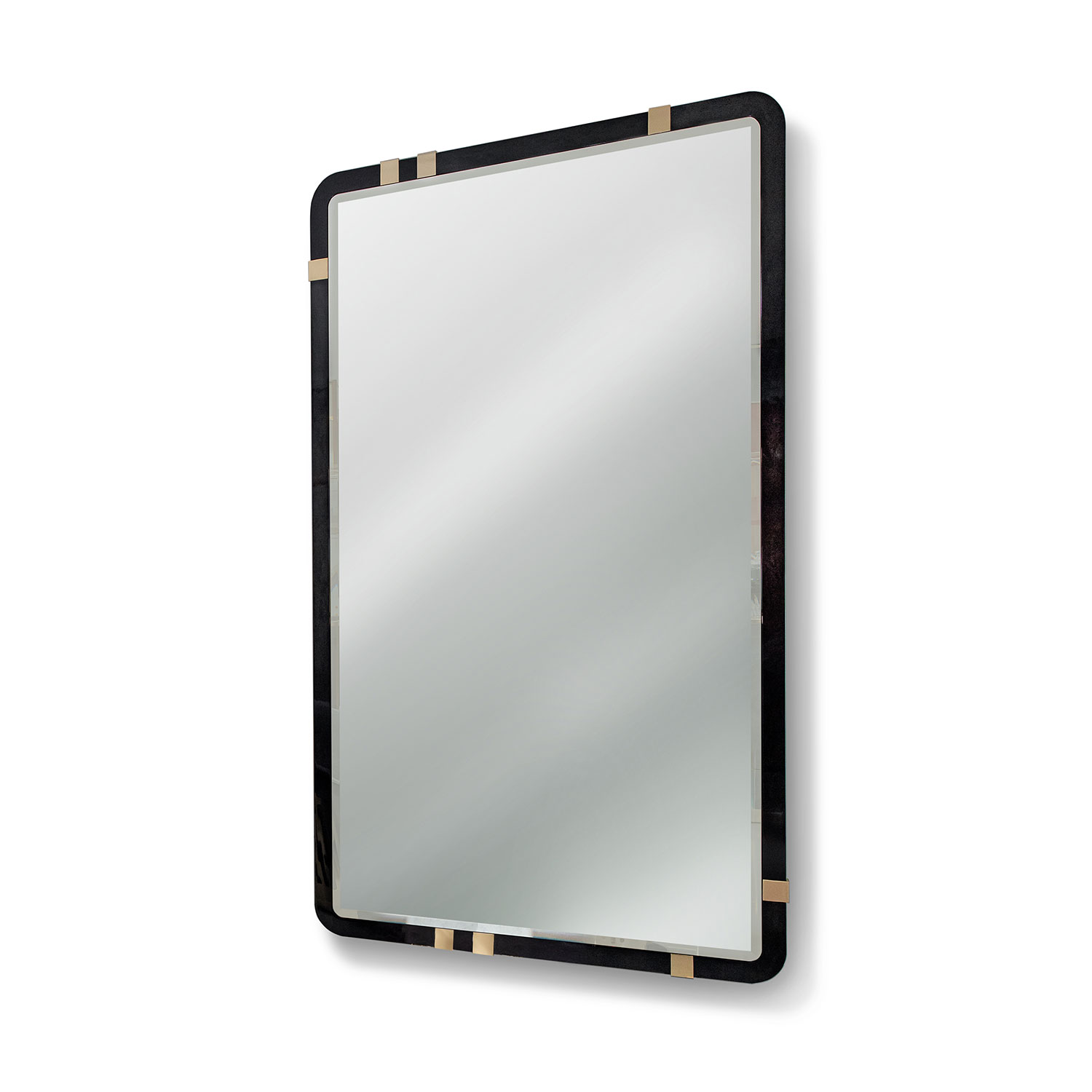 地板长方形镜子,带斜玻璃。框架结合黑色布宾加毛刺贴面与高光泽聚酯表面和浅金色铬不锈钢。