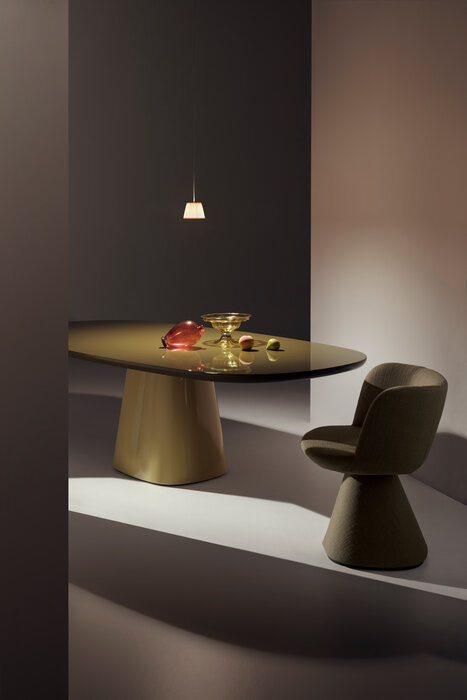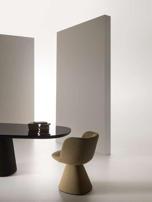 弗莱尔 O' 是一个小的国内宝座, 椅子, 与诱惑 O '表完美匹配。这两个对象从其基地开始建立对话。这两件作品都位于一个截断的金字塔顶上,带有圆润的边缘,以调和优雅和魅力的概念。底座在靠近地板时轻轻地在后侧加宽。它变得几乎不为人注意,并提供了巨大的稳定性,而不会干扰设计的和谐。填充座椅提供必要的舒适性。此外,背靠背的突出倾斜和其包裹形状有助于人们在放松时,不损害理想姿势,在与他人优雅地围绕餐桌互动时采取。此外,椅子还配备了自动返回的旋转机制。面料盖像定制西装一样拥抱Flair O',从座椅到底座完全覆盖它。