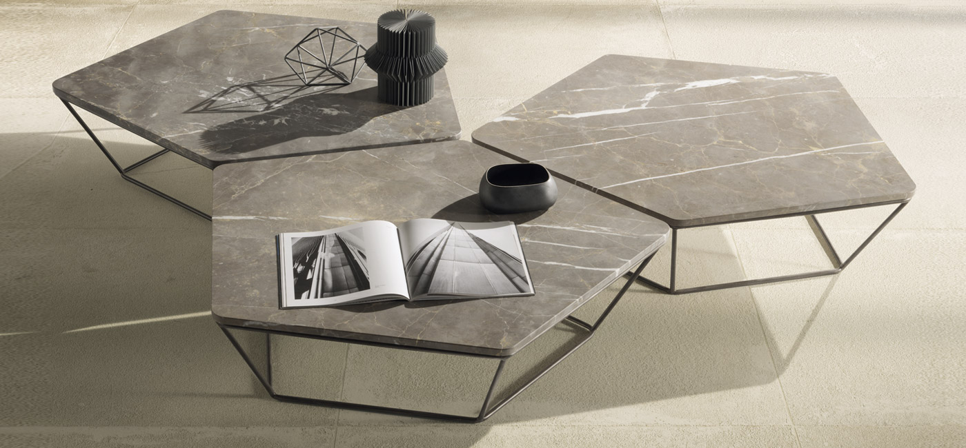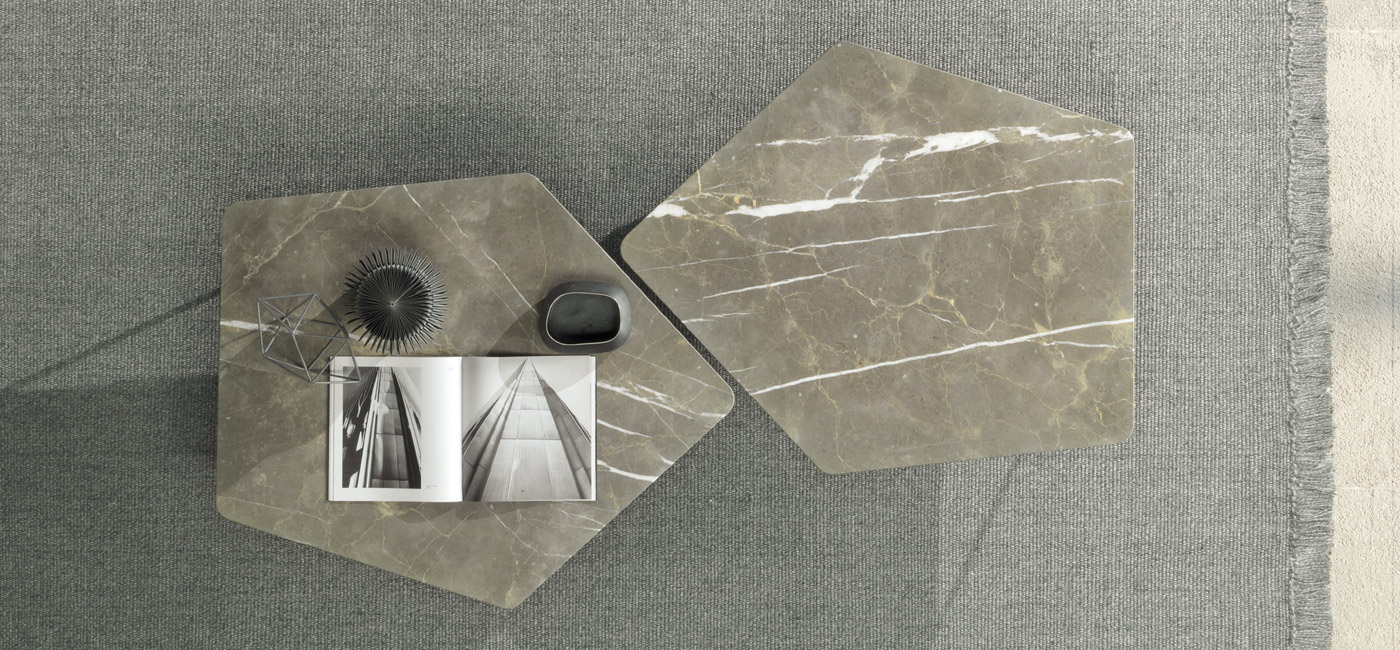 Chocolat 是以独特几何轮廓打造的现代茶几系列。石材和大理石等高档材质的使用,契合了内饰设计行业的最新潮流。可将几张茶几组合在一起,成为一张大桌子。所有的桌面均进行防水和防污渍处理。