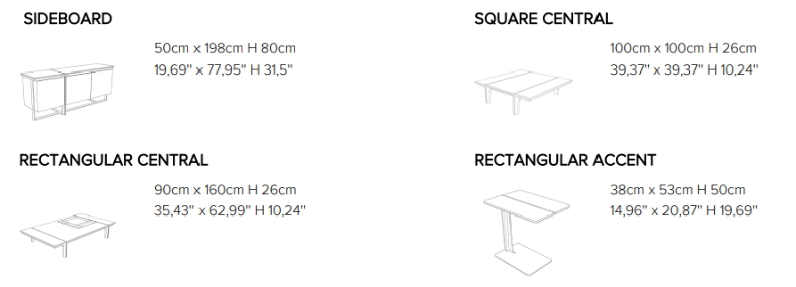 不可拆卸的储物单元采用以皮革为底座的金属材质,搭配桌子的木结构,尽显优美典雅。这种引人注目的对比出现在整个系列的产品中。置物台形式的Kendo咖啡桌为木质结构、金属底座,适于放置书籍、玻璃杯等日常物件,方便实用。