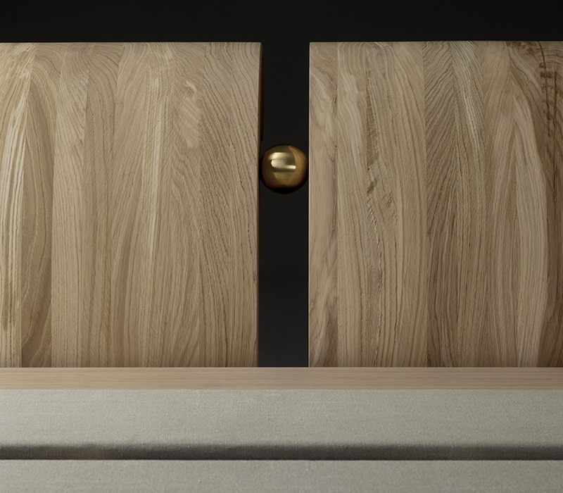 床孟买的结构是固体天然橡木,木板条完全覆盖在亚麻布。两个主板由抛光黄铜球体连接,其颜色阴影往往随着时间而变化,由于完全自然的整理,从而使球体成为作品与圆周气氛不断对话的标志。脚板充当长凳。两个主板都由几个实木块组成,连接并放置得完美无缺,从而传达了单个实木块的印象。这种整体效应是经过对实木块选择的艰苦研究的结果,也是我们主橱柜制造商完美地将一个单元与另一个单元进行完美互补的专业知识的结果。