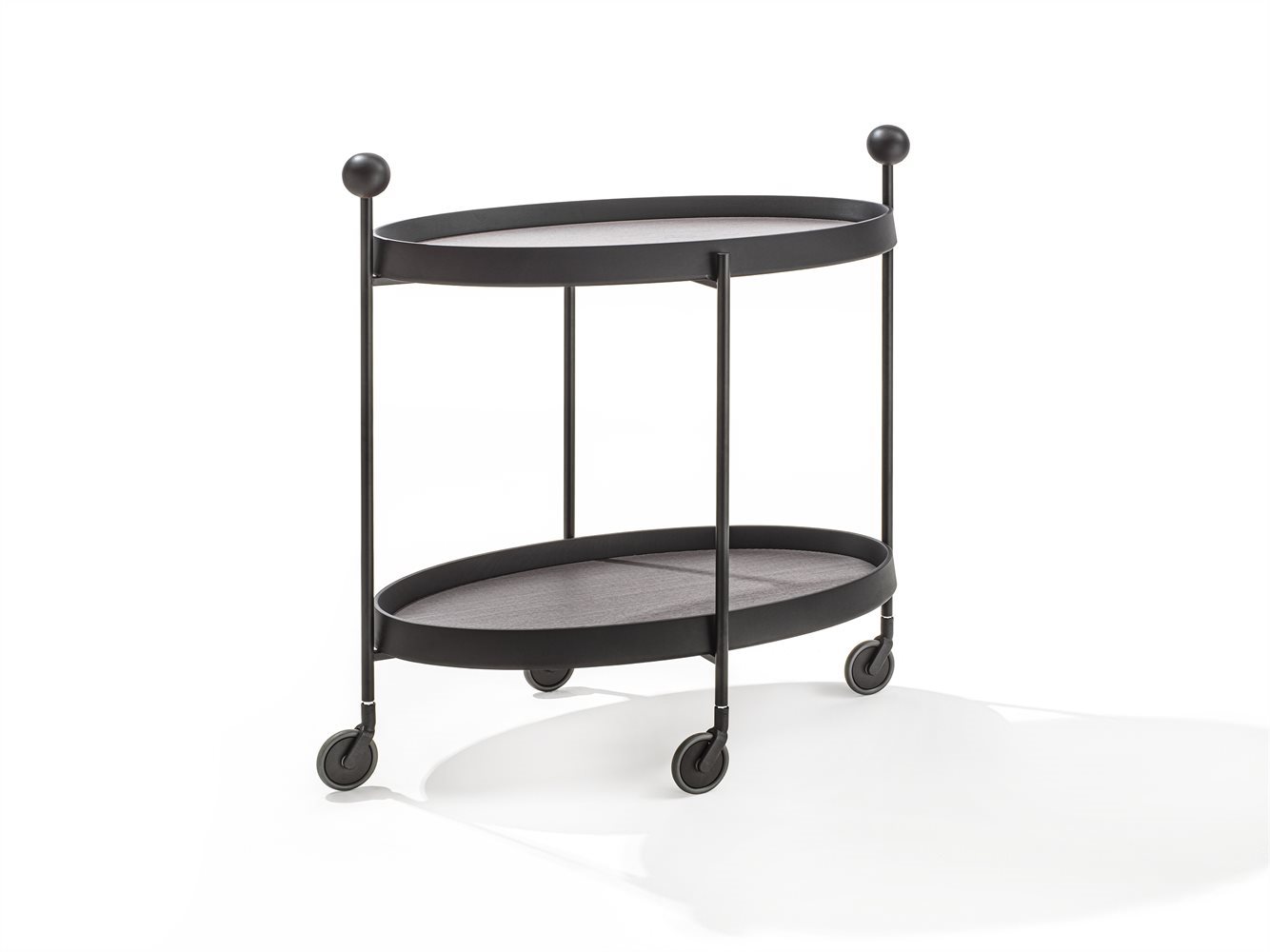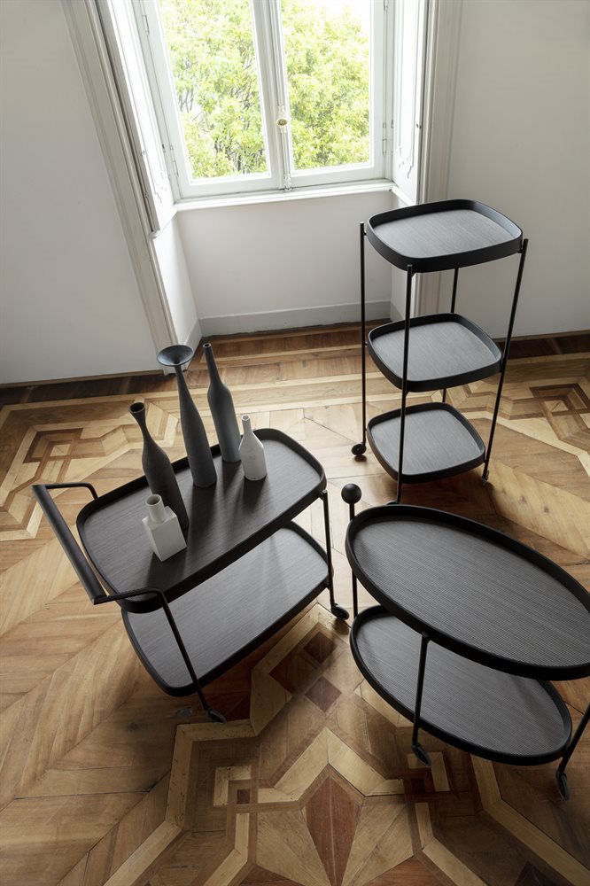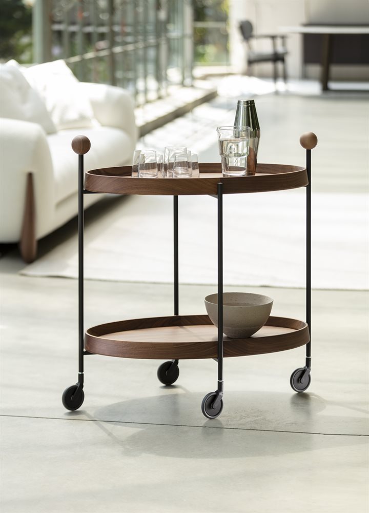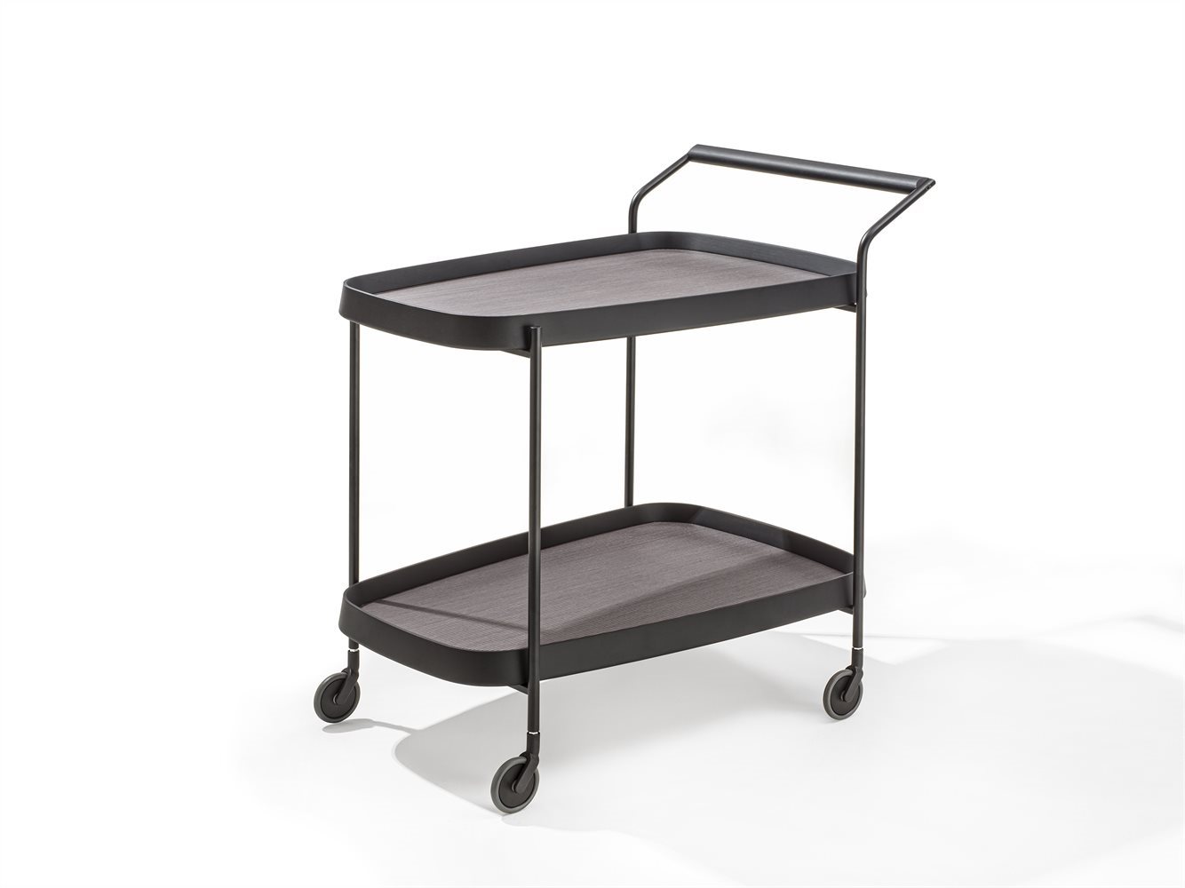 服务手推车与哑光黑色金属底座和木制上衣与固体卡纳莱塔核桃框架。顶部的内部可以在运河核桃,辉煌的漆或微直镶嵌处理。