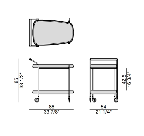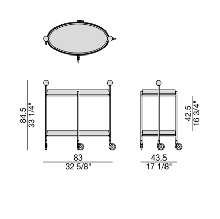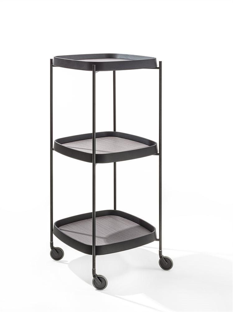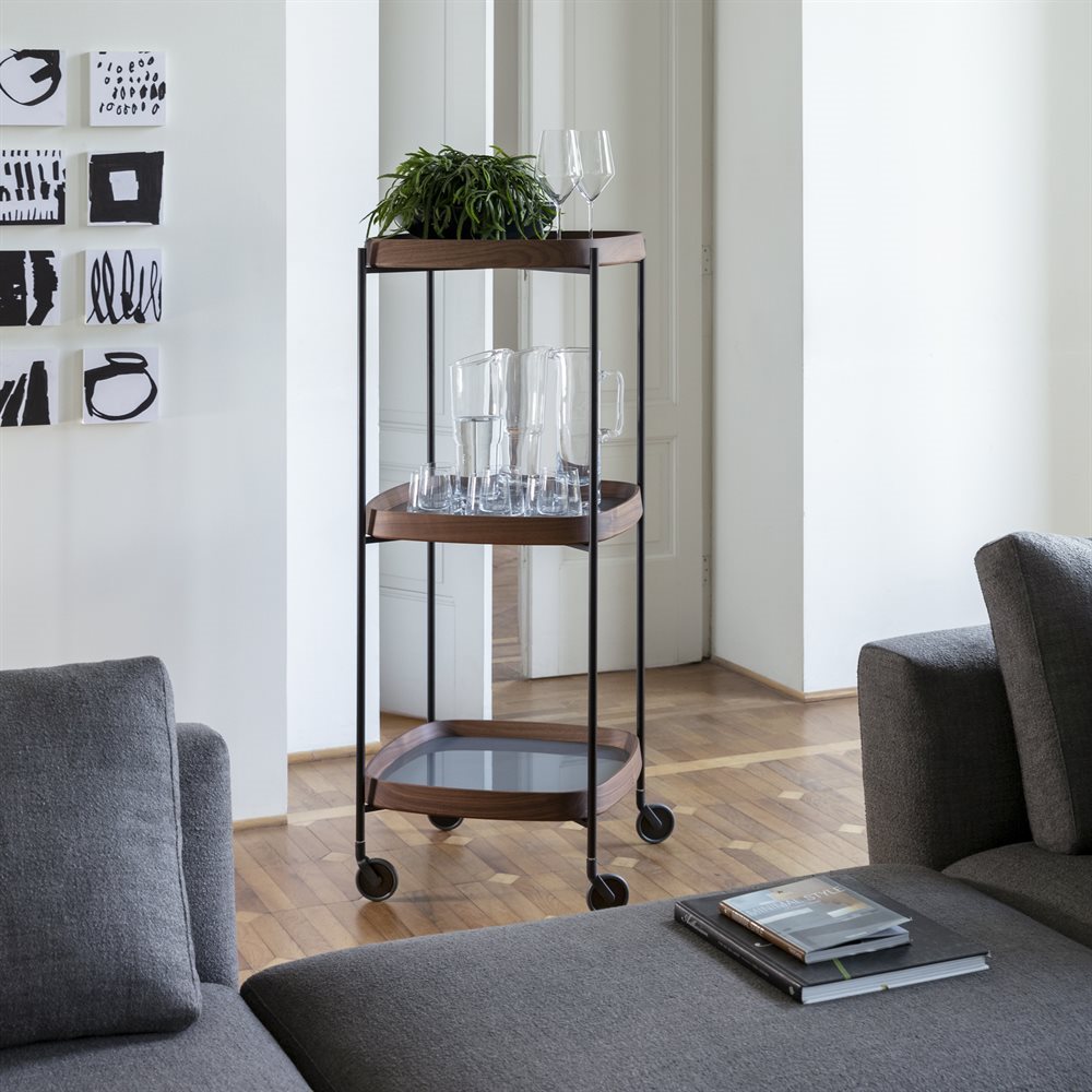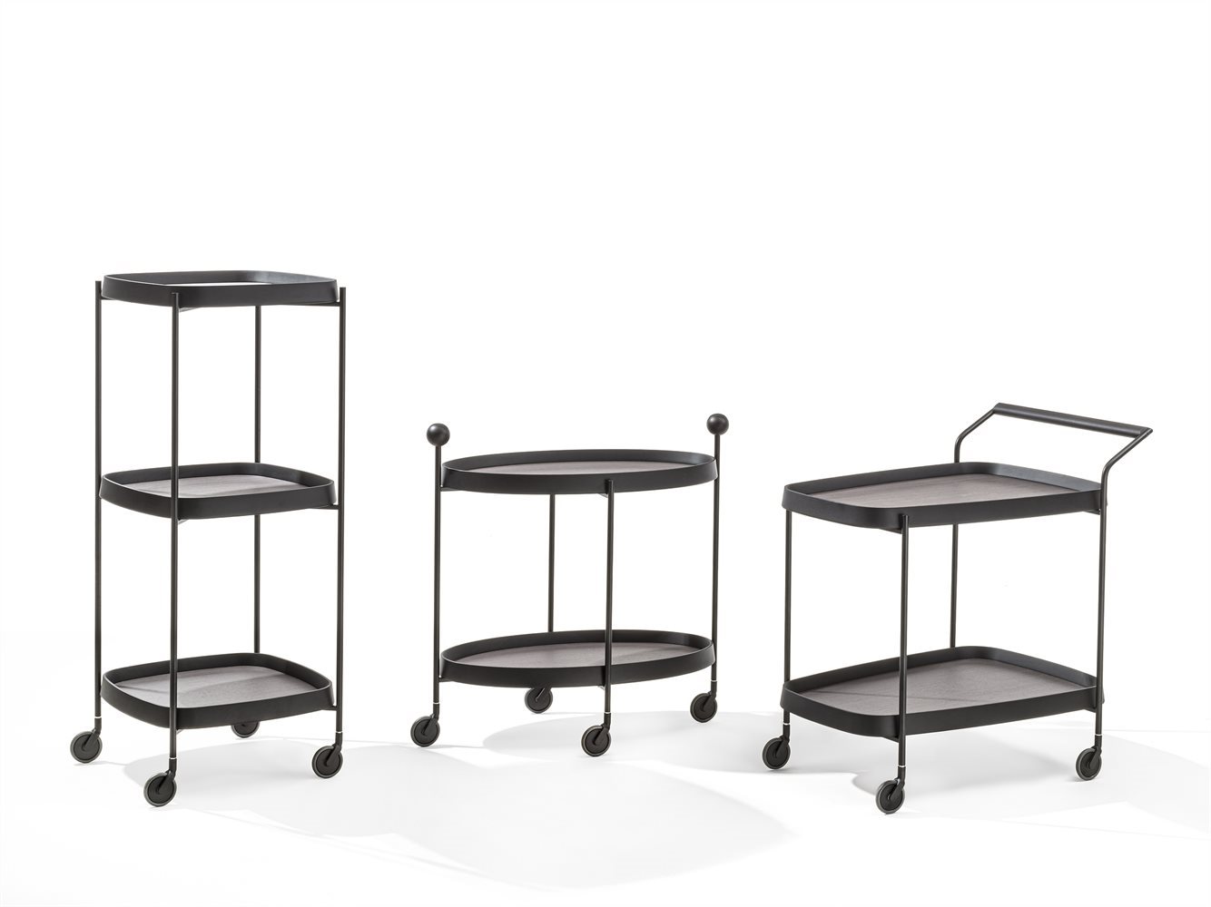 服务手推车与哑光黑色金属底座和木制上衣与固体卡纳莱塔核桃框架。顶部的内部可以在运河核桃,辉煌的漆或微直镶嵌处理。