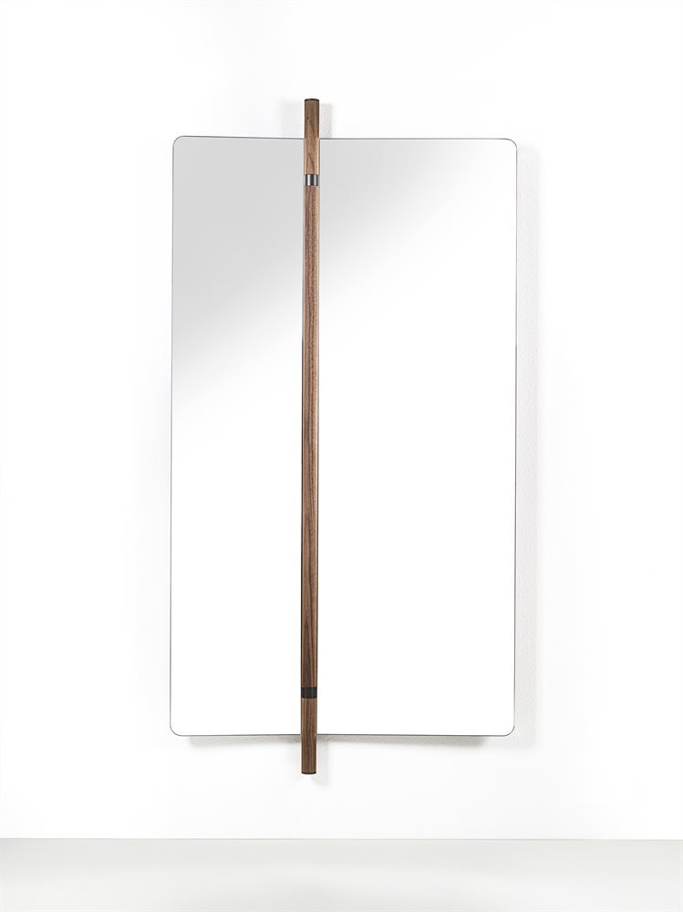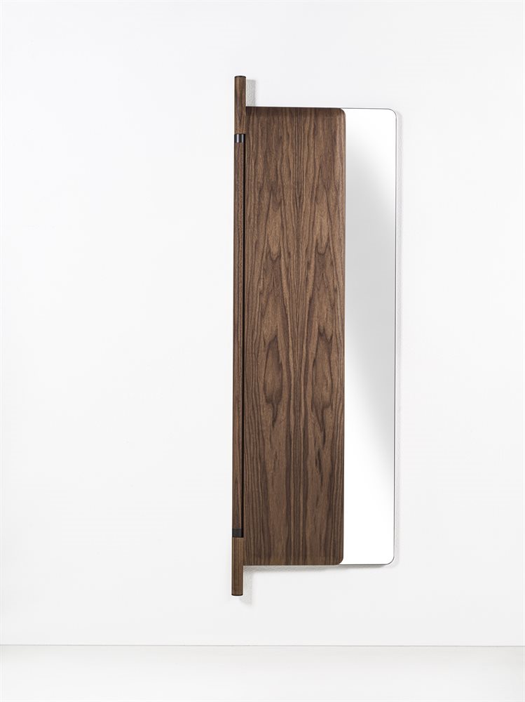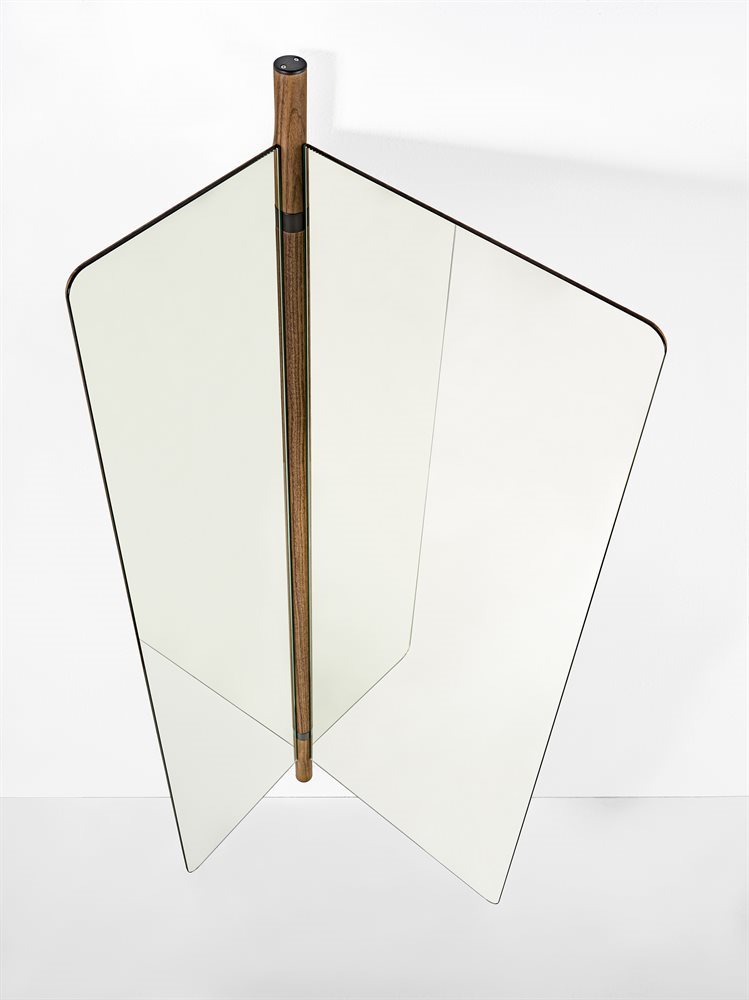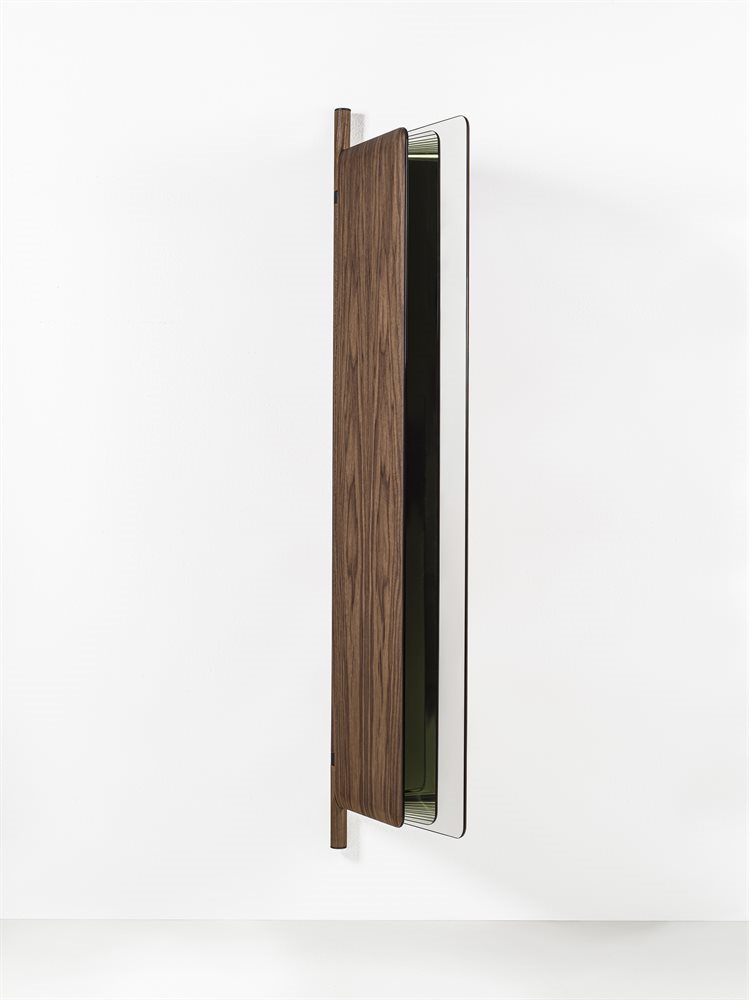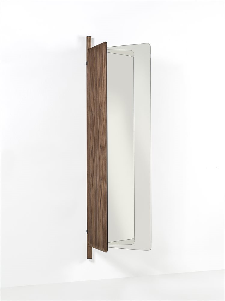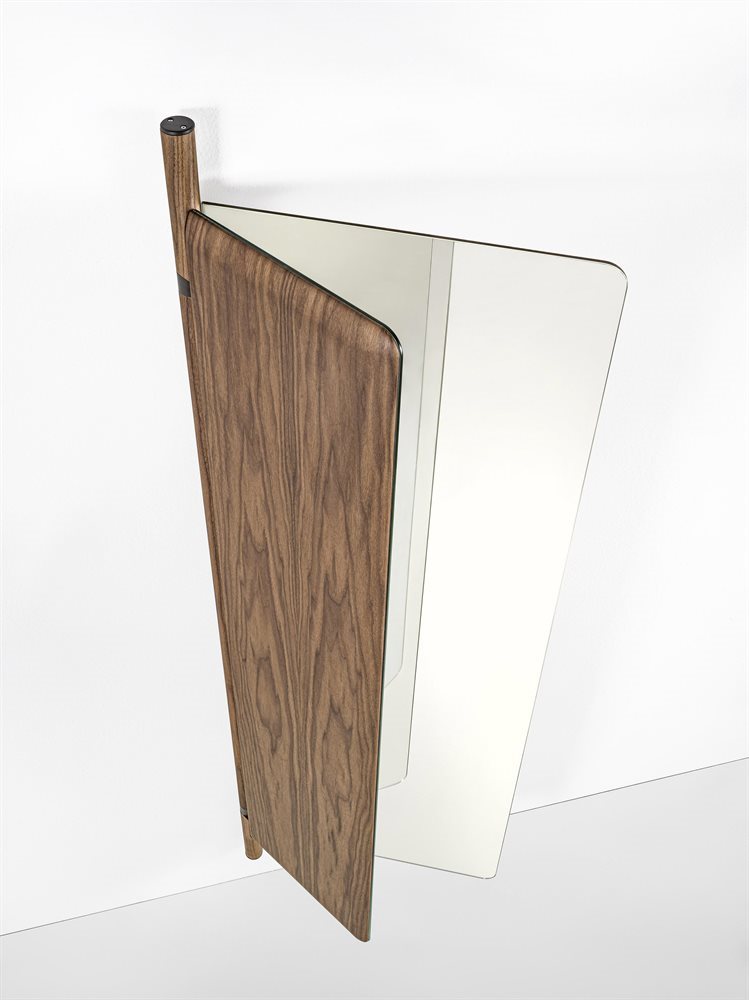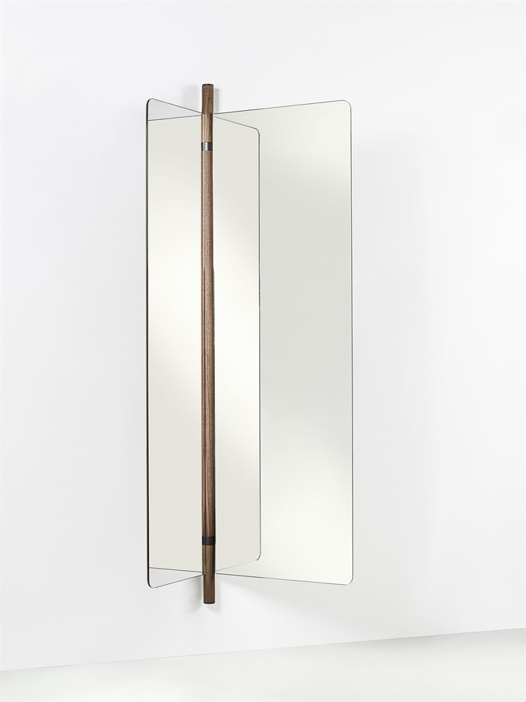 墙面镜由两个折叠元件组成,带有运河核桃背板。中央支柱在固体运河核桃与皮尤特完成金属细节。