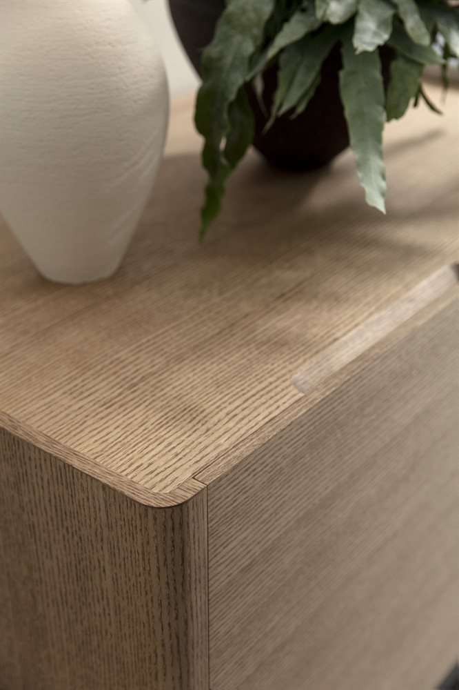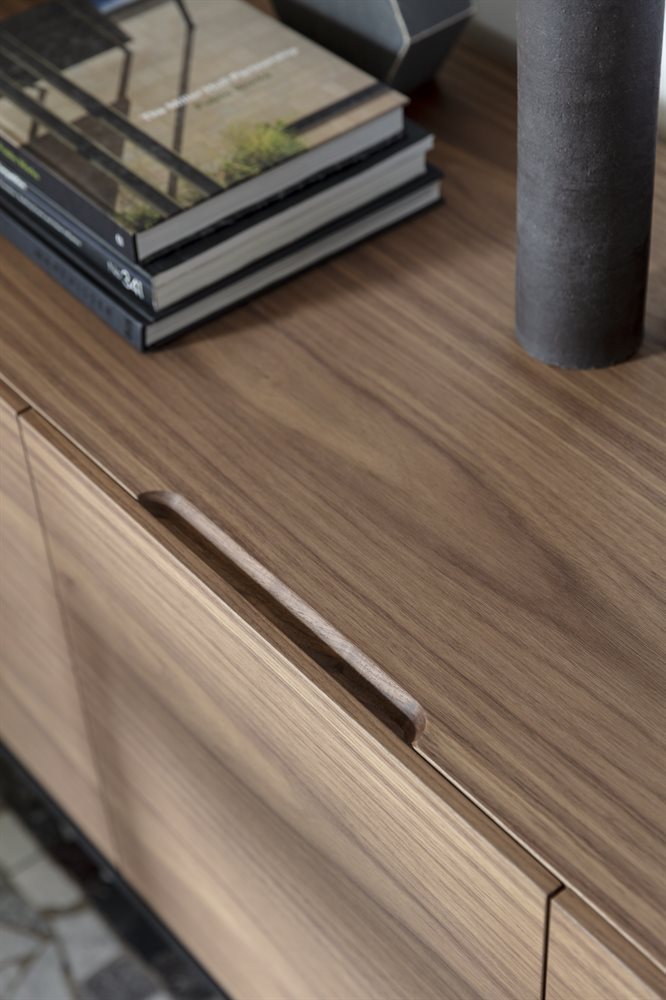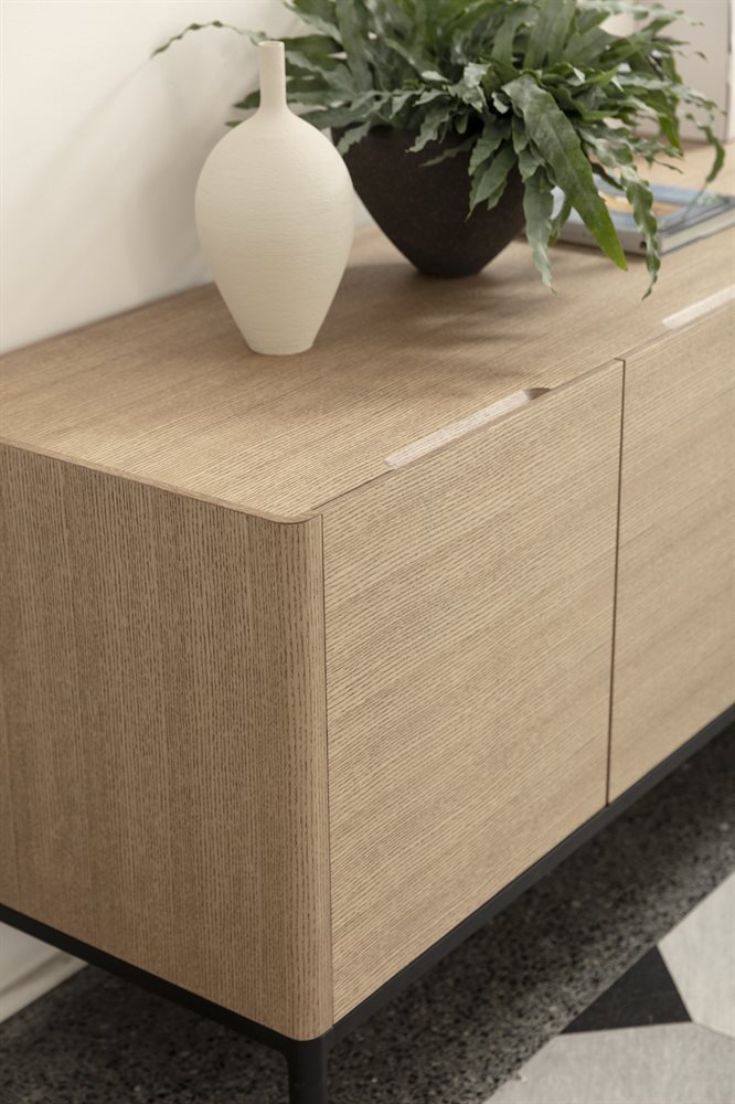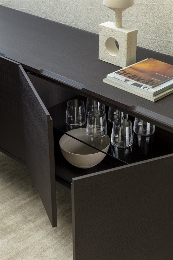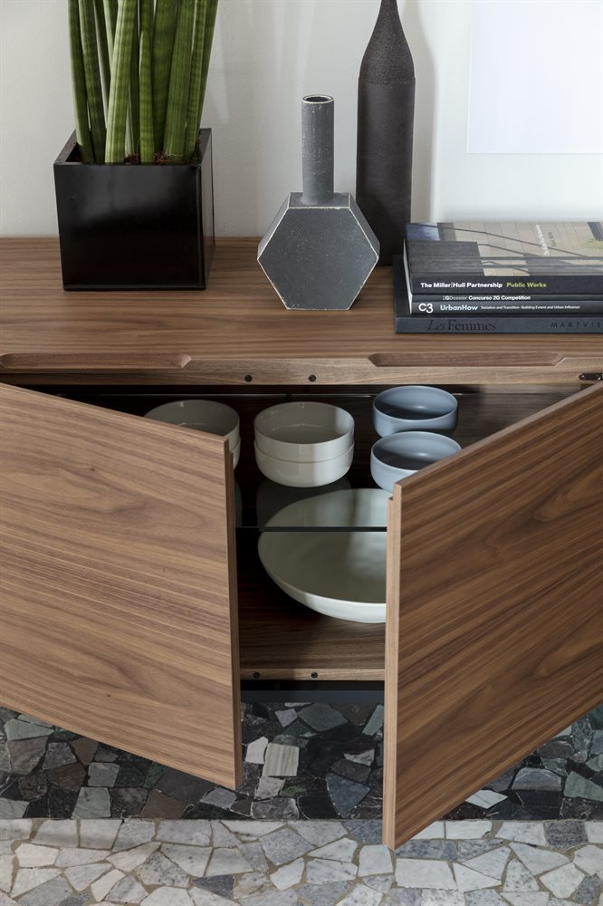 侧板在 Canaletta 核桃或灰烬与金属基础完全由压铸铝, 哑光黑色完成。配有四个铰链门和两个隔间,两个货架在透明玻璃(厚度8毫米)。