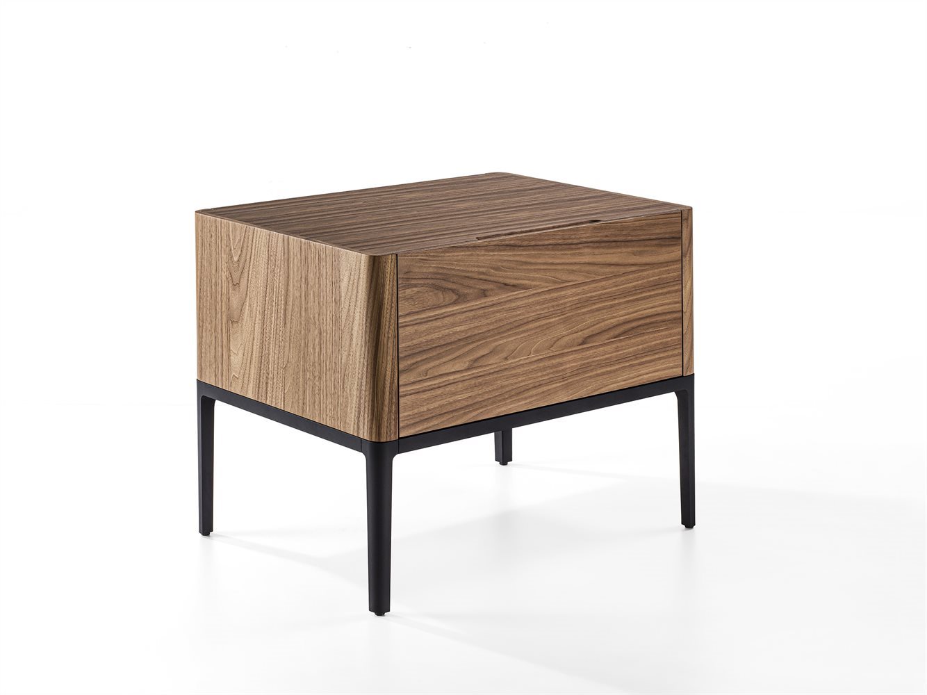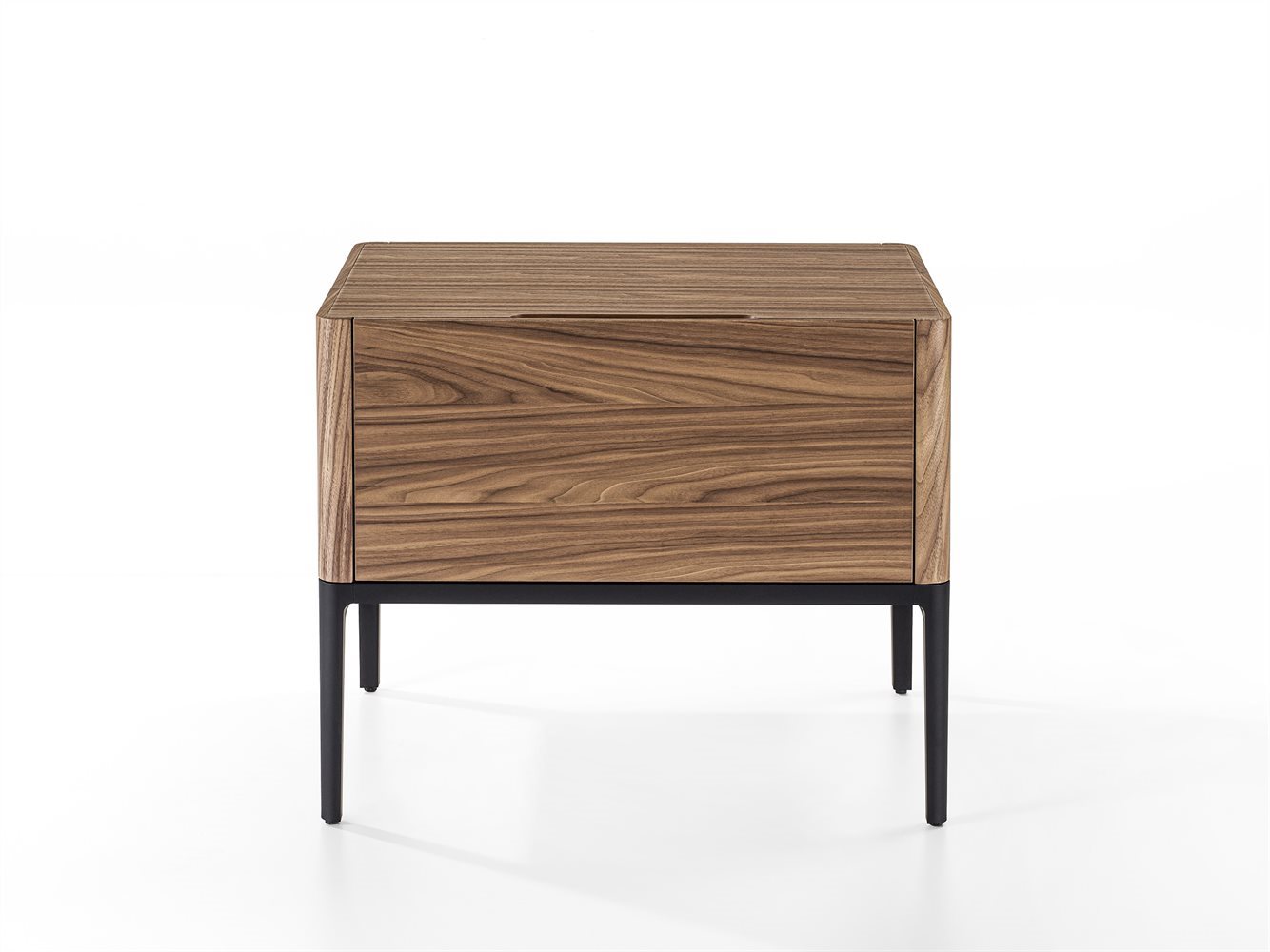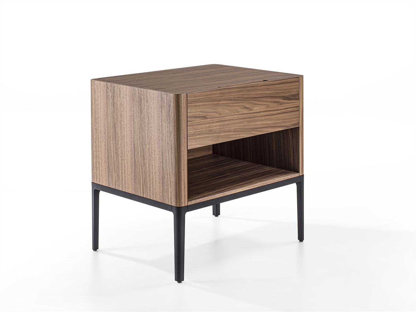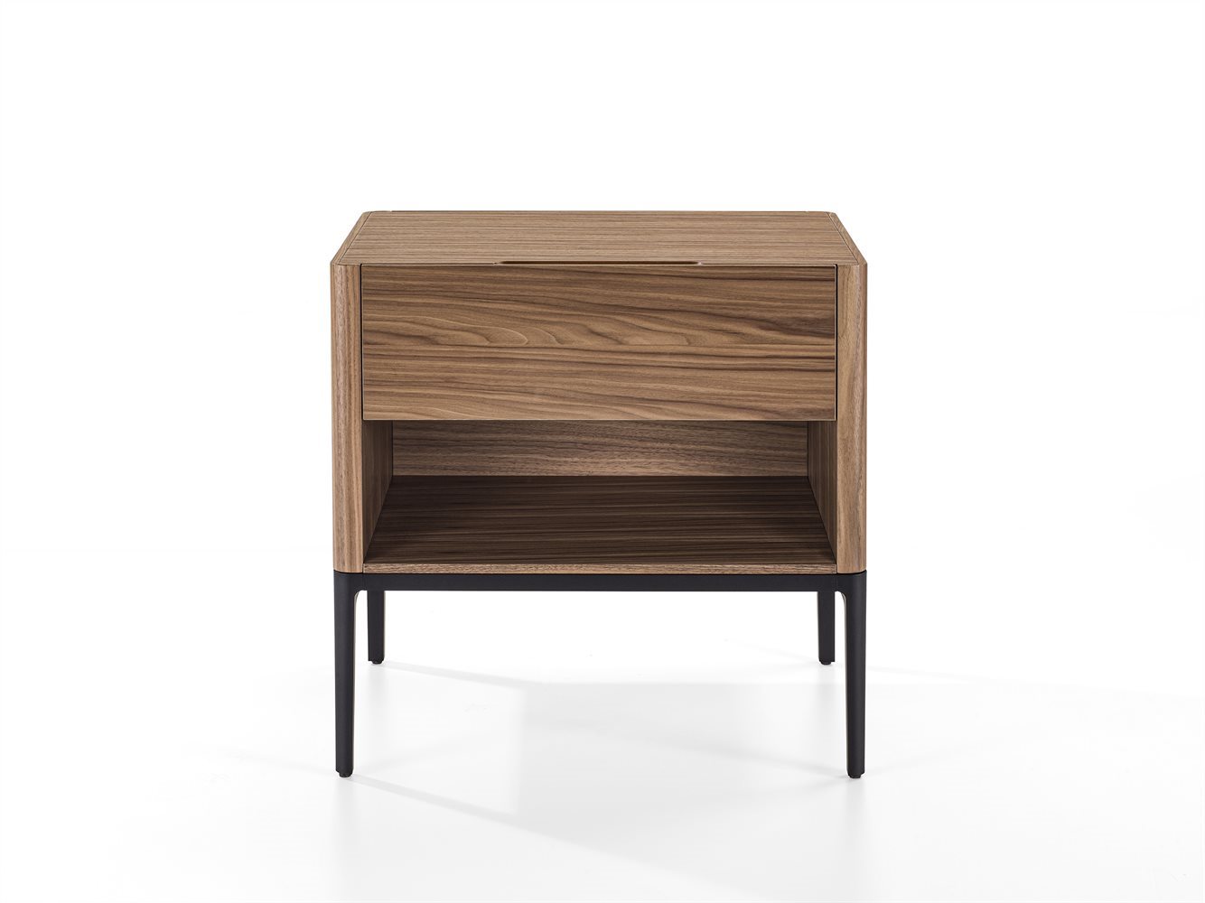 收藏包括两张床头柜 - 有抽屉或抽屉和打开的隔间 - 和抽屉在 Canaletta 核桃与哑光黑色金属底座,完全由压铸铝制成。