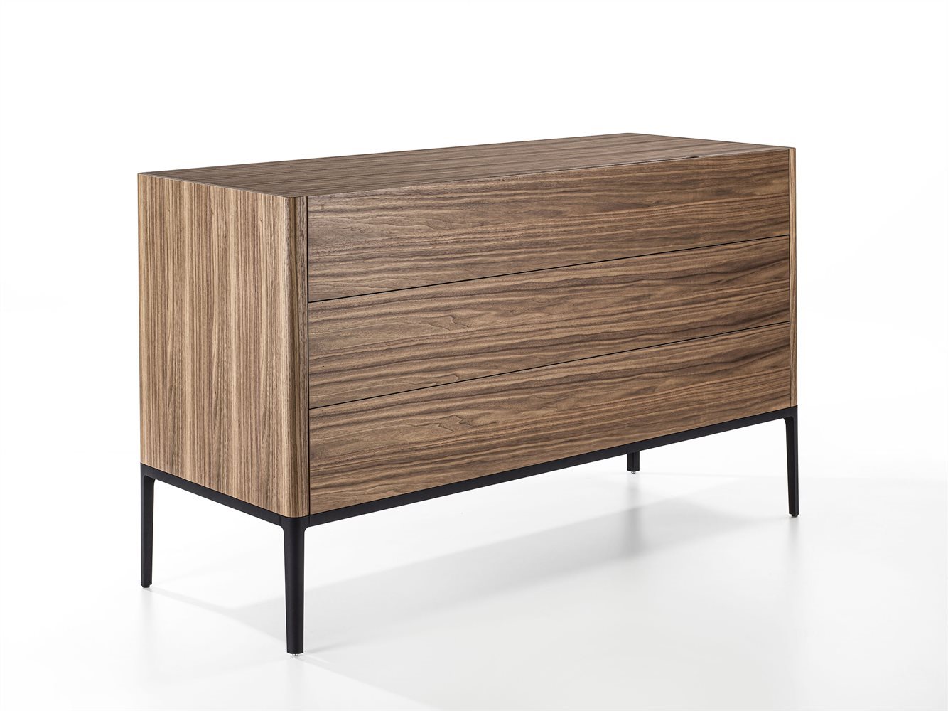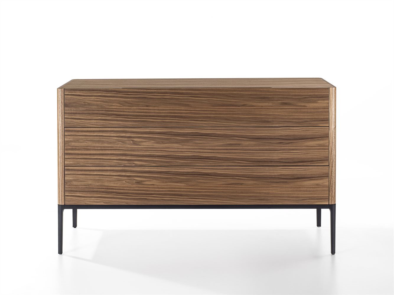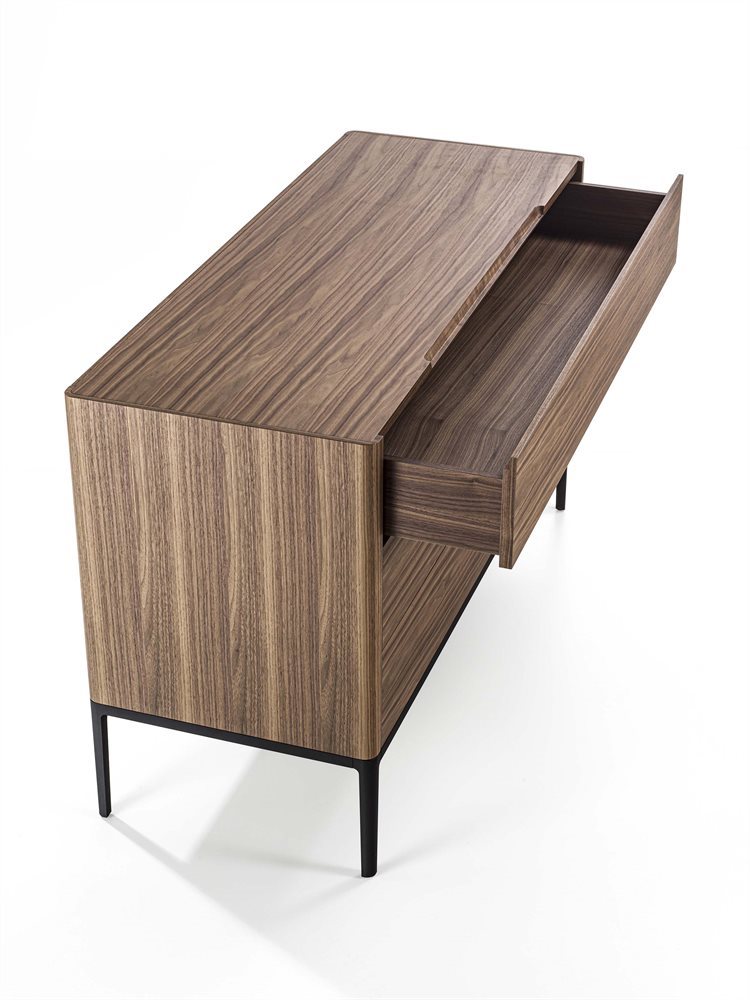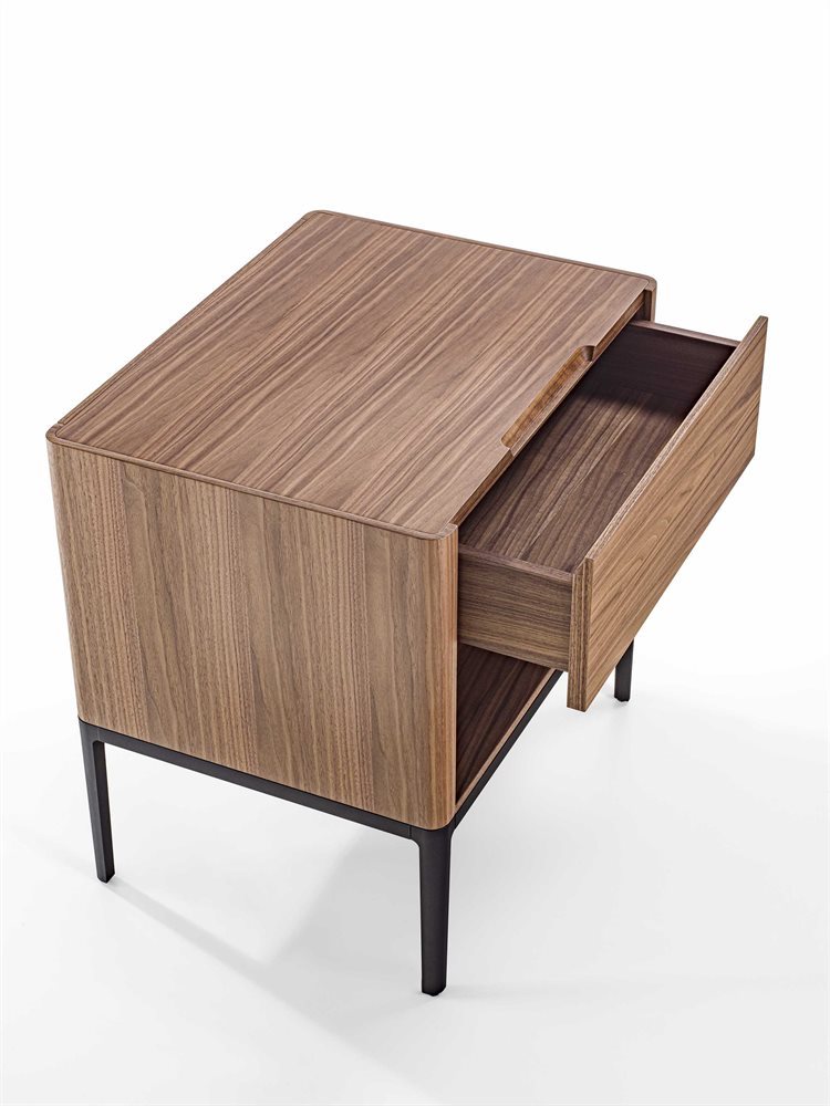 收藏包括两张床头柜 - 有抽屉或抽屉和打开的隔间 - 和抽屉在 Canaletta 核桃与哑光黑色金属底座,完全由压铸铝制成。