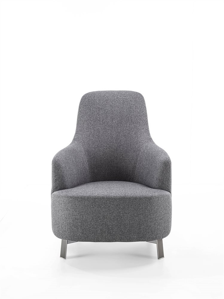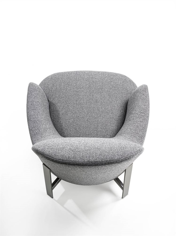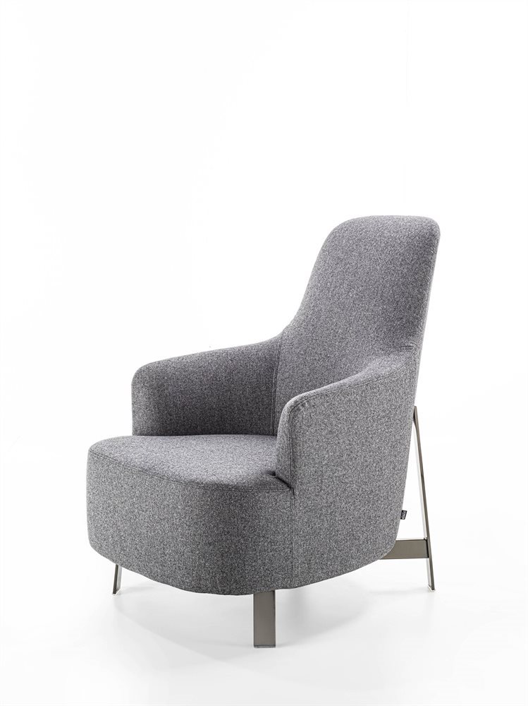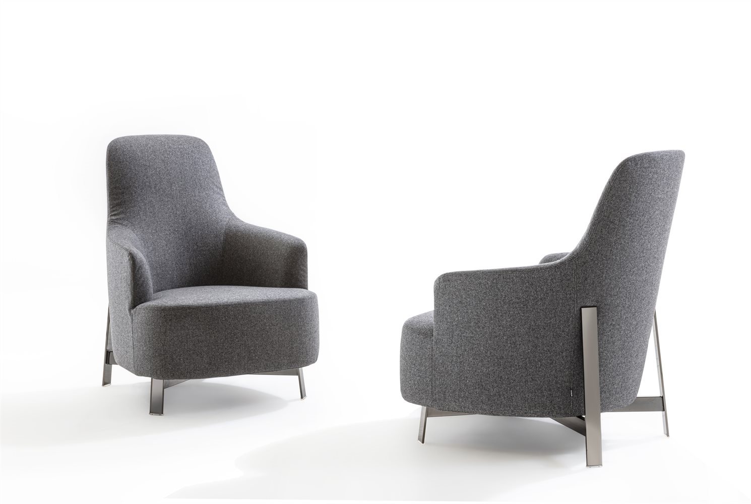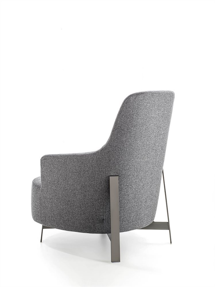 扶手椅,金属结构为黑色镍或刷青铜黄铜和室内装潢在收藏的面料。可拆卸织物盖和不可拆卸皮革盖。将不同织物组合为内部和外部填充结构的可能性。杨树胶合板内部外壳和带带肩带座椅的实心冷杉。聚氨酯填充在不同的高度。