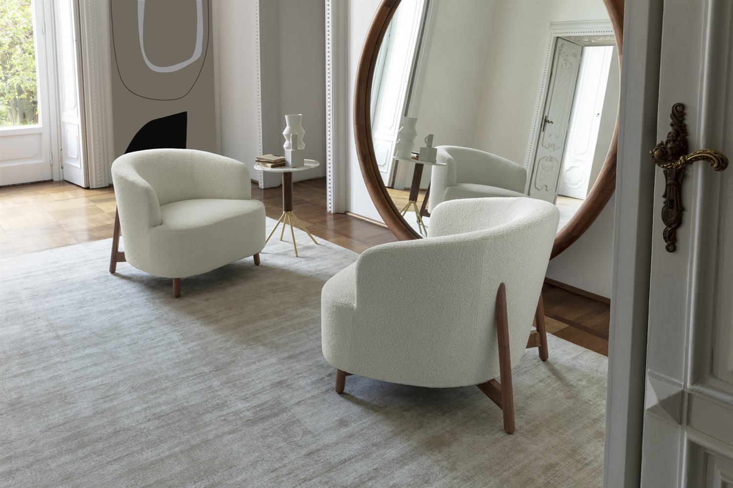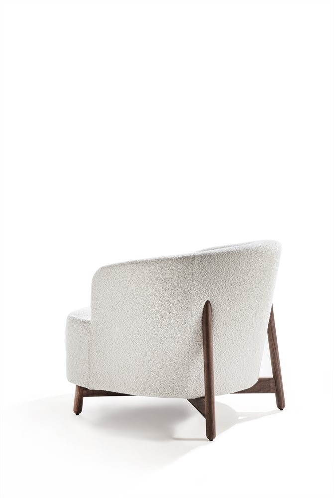 扶手椅与基础结构在坚实的卡纳莱塔核桃和室内装潢在收藏的面料。可拆卸织物盖和不可拆卸皮革盖。将不同织物组合为内部和外部填充结构的可能性。杨树胶合板内部外壳和带带肩带座椅的实心冷杉。聚氨酯填充在不同的高度。