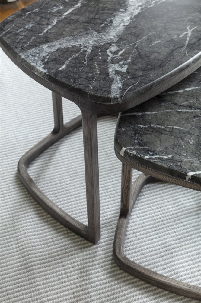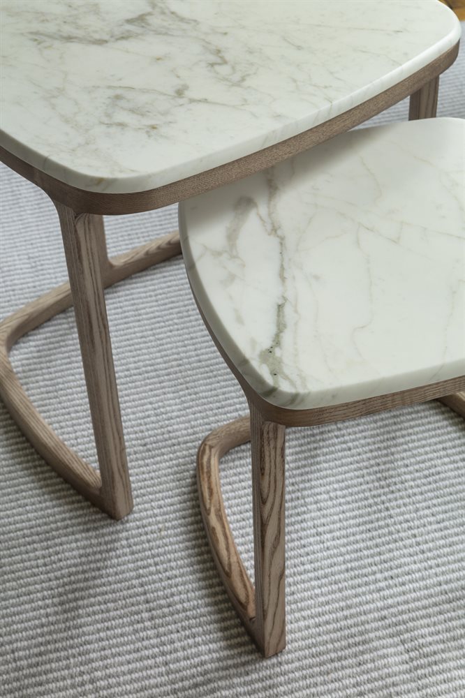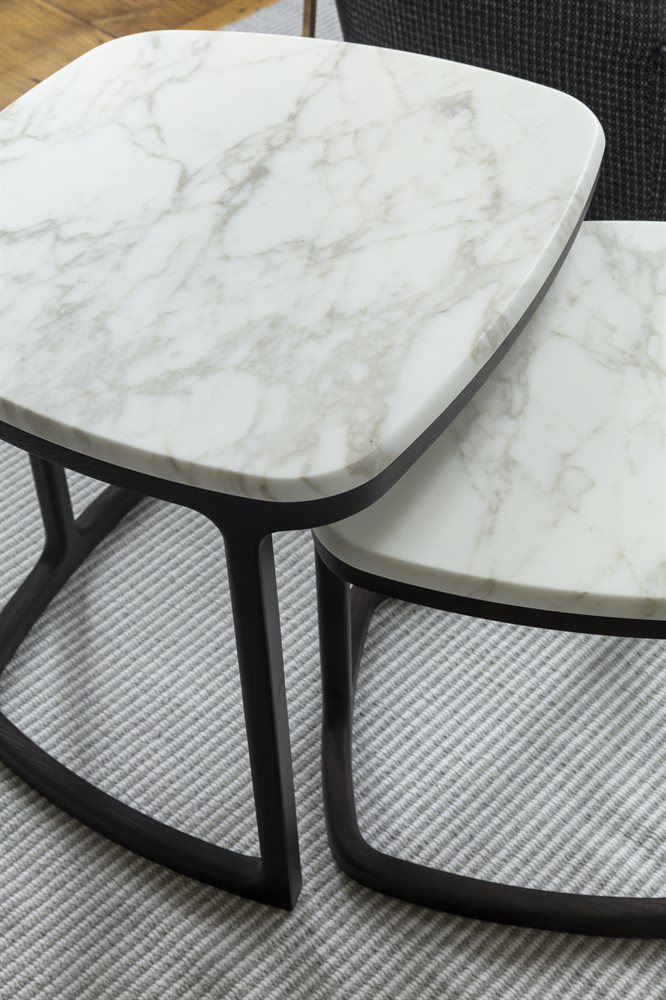 咖啡桌与固体灰烬结构和大理石顶部(20毫米厚)与形状的边缘涂漆哑光聚酯。